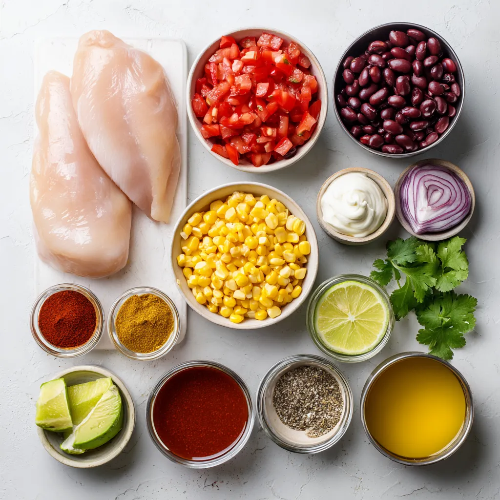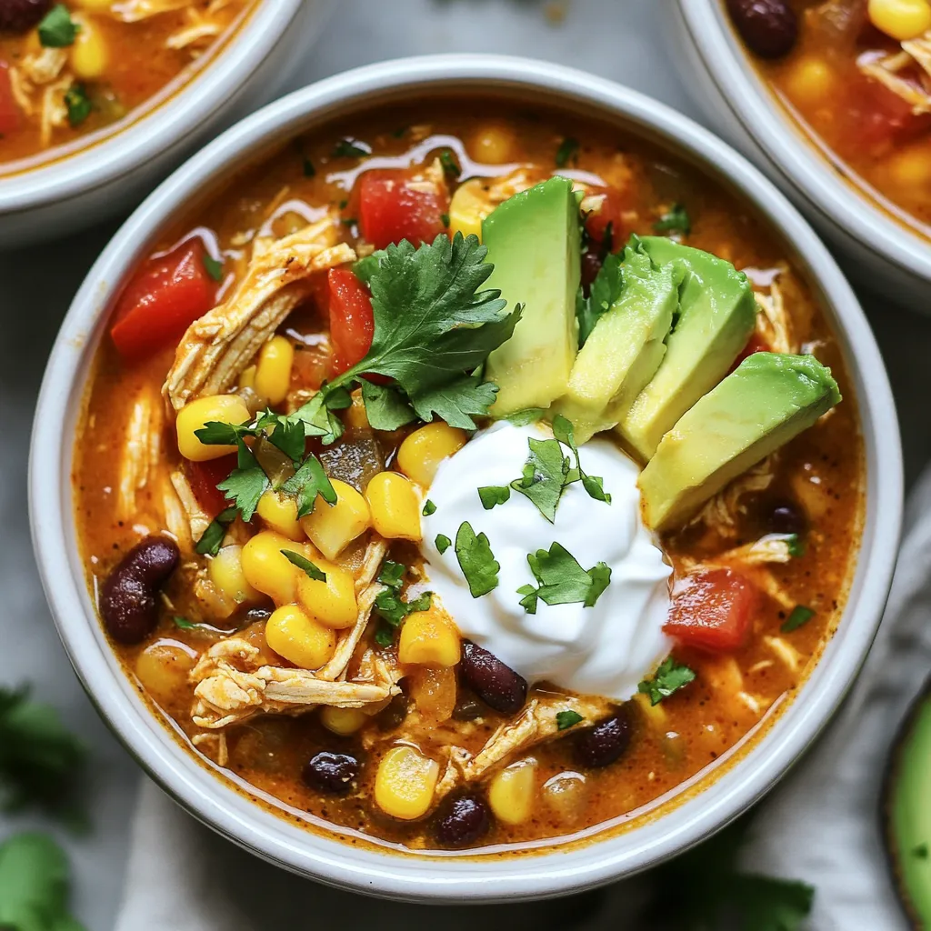 - 1 pound boneless, skinless chicken breasts - 1 can (15 oz) black beans, drained and rinsed - 1 can (15 oz) kidney beans, drained and rinsed - 1 can (15 oz) corn, drained - 1 can (28 oz) diced tomatoes, with juices - 1 medium onion, diced - 2 cloves garlic, minced - 1 cup chicken broth - 1 tablespoon chili powder - 1 teaspoon ground cumin - 1 teaspoon paprika - ½ teaspoon onion powder - ½ teaspoon salt - ½ teaspoon black pepper - Shredded cheese - Avocado slices - Fresh cilantro - Sour cream - Lime wedges You can swap chicken breasts for thighs for a richer taste. If you want a vegetarian option, use jackfruit or tofu instead of chicken. Use vegetable broth instead of chicken broth for a plant-based soup. For the beans, you can mix and match according to your taste. You can even add pinto beans or chickpeas. If you don't have fresh garlic, garlic powder works too. For spices, feel free to adjust based on your spice level. {{ingredient_image_1}} Start by gathering your ingredients. You will need: - 1 pound boneless, skinless chicken breasts - 1 can (15 oz) black beans, drained and rinsed - 1 can (15 oz) kidney beans, drained and rinsed - 1 can (15 oz) corn, drained - 1 can (28 oz) diced tomatoes, with juices - 1 medium onion, diced - 2 cloves garlic, minced - 1 cup chicken broth - 1 tablespoon chili powder - 1 teaspoon ground cumin - 1 teaspoon paprika - ½ teaspoon onion powder - ½ teaspoon salt - ½ teaspoon black pepper Place the boneless chicken breasts at the bottom of your slow cooker. In a mixing bowl, combine the black beans, kidney beans, corn, diced tomatoes, diced onion, and minced garlic. Stir the mixture well. Next, pour this bean and tomato mixture over the chicken in the slow cooker. In another bowl, mix the chicken broth, chili powder, cumin, paprika, onion powder, salt, and black pepper. Pour this seasoning mixture over everything in the slow cooker. Cover the slow cooker with its lid. You can cook it on low for 6 to 8 hours. If you are in a hurry, use the high setting for 4 to 6 hours. The chicken should be tender and cooked through. When cooking time is done, carefully remove the chicken breasts. Use two forks to shred them into bite-sized pieces. Return the shredded chicken to the soup and stir everything together. Taste the soup and adjust the seasoning if needed. Add more salt or spices to suit your taste. Serve the soup hot in bowls. Feel free to add optional toppings like shredded cheese, avocado slices, cilantro, sour cream, and lime wedges for added flavor and texture. Enjoy your warm bowl of tasty chicken taco soup! To make the best slow cooker chicken taco soup, start with fresh ingredients. Fresh veggies and spices bring out the best taste. Use skinless chicken breasts for a leaner soup. Pay attention to the layering in the slow cooker. Place the chicken first, then add the bean mixture. This helps the chicken soak up all the flavors. When mixing your spices, always taste as you go. Adjust to your liking. Want more heat? Add extra chili powder. Prefer it milder? Cut back on the spices. One common mistake is not shredding the chicken properly. If you don’t shred well, the chicken won’t mix into the soup. Make sure to use two forks to pull the chicken apart. Another mistake is not letting the soup cook long enough. If you rush it, the chicken may be tough. Always follow the cooking times. Overloading the slow cooker can also ruin the soup. Stick to the recipe amounts. Too many ingredients can lead to uneven cooking. To thicken your soup, try a few simple tricks. One way is to mash some of the beans with a fork before mixing them in. This adds creaminess without extra ingredients. Another method is to add cornmeal or masa harina. Just mix a small amount with water first, then stir it into the soup. This gives a nice texture. If you want a smoother soup, blend part of it with an immersion blender. This adds thickness while keeping some chunks for texture. Pro Tips Use Leftover Chicken: Shredded rotisserie chicken can be a great shortcut for this recipe, saving you time while adding great flavor. Spice it Up: Adjust the heat by adding diced jalapeños or a splash of hot sauce if you like your soup with a kick. Freezing Tips: This soup freezes well! Make a double batch and store leftovers in an airtight container for up to 3 months. Fresh Herbs: Adding fresh cilantro or parsley as a garnish just before serving enhances the flavor and freshness of the soup. {{image_2}} You can make a tasty vegetarian version of this soup. Replace the chicken with one can of chickpeas or lentils. This keeps the protein high and the flavor strong. Use vegetable broth instead of chicken broth. The other ingredients stay the same. You will still get the same rich, taco flavor in every bite. If you love heat, add chopped jalapeños or a teaspoon of cayenne pepper. These spices will give your soup a great kick. For a milder soup, skip the spicy additions. You can also use mild salsa instead of diced tomatoes. This way, your soup can be as fiery or as gentle as you like. Feel free to mix in more veggies. Diced bell peppers, zucchini, or corn add great taste and texture. You can also toss in some spinach or kale for a healthy boost. If you want to add more protein, consider black-eyed peas or TVP (textured vegetable protein). This soup is flexible, and you can make it your own! To store leftover chicken taco soup, let it cool to room temperature. Then, pour the soup into airtight containers. Make sure to leave some space at the top for expansion. Label the containers with the date. Store them in the fridge for up to three days. If you want to keep it longer, use the freezer. When you are ready to eat the soup again, you can reheat it easily. Pour the soup into a pot over medium heat. Stir it often until it's hot all the way through. This usually takes about 10 minutes. You can also use the microwave. Place the soup in a microwave-safe bowl. Heat it in short bursts, stirring in betwe