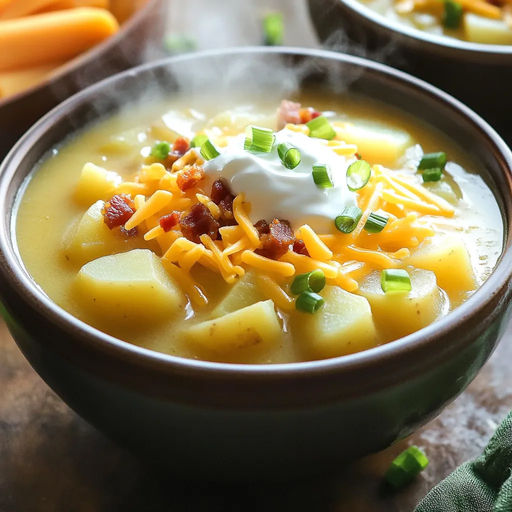 - 6 medium russet potatoes, peeled and diced - 1 large onion, chopped - 4 cloves garlic, minced - 4 cups vegetable broth - 1 cup heavy cream - 1 cup shredded sharp cheddar cheese - 1 cup cooked bacon bits - Chopped green onions for garnish - Sour cream for topping - 1 tablespoon olive oil - 2 teaspoons dried thyme - 2 teaspoons paprika - Salt and pepper to taste When making loaded potato soup, the right ingredients are key. You start with 6 medium russet potatoes. These potatoes give the soup its hearty base. Peel and dice them for even cooking. Next, grab a large onion and chop it finely. The onion adds depth and sweetness to the soup. Now, let’s not forget garlic! You need 4 cloves, minced well. Garlic brings in a punch of flavor. For the broth, use 4 cups of vegetable broth. This makes the soup rich and satisfying. To make it creamy, add 1 cup of heavy cream. It gives the soup a smooth texture. For that cheesy goodness, you need 1 cup of shredded sharp cheddar cheese. This cheese melts beautifully into the soup. If you want to take it up a notch, consider adding 1 cup of cooked bacon bits. They add a nice crunch and flavor. Green onions make a great garnish. They add color and a fresh taste. Don't forget sour cream for topping; it gives a nice tang. For the seasonings, start with 1 tablespoon of olive oil. It helps sauté the onion and garlic. Use 2 teaspoons of dried thyme and 2 teaspoons of paprika for warmth. Finally, add salt and pepper to taste. Adjust these to make your soup perfect for you. With these ingredients, you’re on your way to a cozy bowl of loaded potato soup. - Sautéing the onion and garlic Start by heating 1 tablespoon of olive oil in a large skillet over medium heat. Add 1 large chopped onion and cook for about 5 minutes. This makes the onion soft and sweet. Next, add 4 minced garlic cloves. Cook for an extra 1 to 2 minutes until you smell that lovely garlic aroma. - Preparing the potatoes and broth mixture In your slow cooker, add the sautéed onion and garlic. Then, toss in 6 peeled and diced russet potatoes. Pour in 4 cups of vegetable broth, along with 2 teaspoons of dried thyme and 2 teaspoons of paprika. Don’t forget to season with salt and pepper to taste. Stir everything together well. - Cooking times and temperature settings Cover your slow cooker and set it on low for 6 to 8 hours. If you're in a hurry, you can set it on high for 4 hours. The potatoes should become nice and tender during this time. - Mashing and finishing the soup Once the cooking time is done, use a potato masher to mash the potatoes. You can leave some chunks for texture if you like. Stir in 1 cup of heavy cream and 1 cup of shredded sharp cheddar cheese. If you want, add 1 cup of cooked bacon bits for extra flavor. Stir everything until well mixed. Let it cook on low for 15 to 30 more minutes to heat through. - Presentation ideas Serve the soup hot in bowls. It looks great with a swirl of cream on top for a fancy touch. - Best garnishes and toppings Top each bowl with a dollop of sour cream and a sprinkle of chopped green onions. These add a nice crunch and color to your dish. Enjoy your cozy bowl of loaded potato soup! - Choosing the right potatoes: I love using medium russet potatoes. They are starchy and create a creamy texture. Avoid waxy potatoes as they do not break down well in soups. - Adjusting creaminess and thickness: If you want a thicker soup, mash more potatoes. For a creamier soup, add more heavy cream. You can also stir in some sour cream for extra richness. - Overcooking the potatoes: Set your slow cooker to low for 6-8 hours. If you cook too long, the potatoes may turn to mush. Keep an eye on the time! - Skipping the seasoning adjustments: Taste your soup near the end of cooking. You may need to add more salt or pepper for flavor. Always adjust to your taste. - Adding herbs or spices: Fresh herbs like parsley or chives can brighten the soup. Thyme and paprika add warmth. Feel free to experiment with your favorites! - Cheese alternatives and variations: If you want to switch things up, try different cheeses. Gouda or Monterey Jack will work well. You can also use vegan cheese for a dairy-free option. {{image_2}} You can easily make this soup vegetarian or vegan. For dairy, use plant-based milk or cream. Almond milk or coconut cream work well. For the cheese, try vegan cheese shreds. If you want to skip bacon, add smoked paprika for that smoky flavor. Feel free to add more veggies! Carrots, celery, or even spinach can boost nutrition. Just chop them up and toss them in with the potatoes. Want to mix things up? Add spices! Cumin gives a warm touch. Chili powder adds heat. Just sprinkle in a teaspoon or two while cooking. You can also mix in other vegetables. Corn or bell peppers add sweetness. Just make sure they are chopped small. This way, they cook evenly in the soup. Pair your soup with some tasty sides. A fresh salad adds crunch and color. Try a Caesar or garden salad for balance. Warm bread also complements this soup well. A crusty baguette or garlic bread will soak up the flavors. Your meal will feel complete and cozy! For storing your leftover soup, use airtight containers. Glass or plastic containers work well. Make sure the soup cools down before sealing. This helps to keep it fresh. Store it in the fridge for up to 3 days. If you want to keep it longer, freezing is a great option. To reheat your soup, the microwave is quick and easy. Pour the soup into a bowl and heat it for 1-2 minutes. Stir halfway through for even heating. If you prefer, you can reheat it on the stove over medium heat. Stir often to avoid sticking. If the soup is too thick, add a splash of broth or cream. This will help adjust the consistency. To freeze the soup, let it cool completely first. Pour it into freezer-safe bags or containers. Make sure to leave some space for expansion. Label the containers with the date. The soup can last in the freezer for up to 3 months. To thaw, move 
