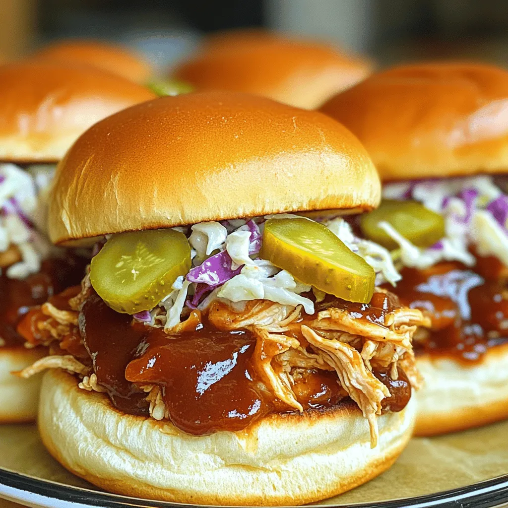 - 2 pounds boneless, skinless chicken breasts - 1 cup chicken broth - 1/2 cup BBQ sauce - 1 tablespoon apple cider vinegar - 1 tablespoon brown sugar For my slow cooker pulled chicken sliders, I start with the chicken. I use two pounds of boneless, skinless chicken breasts. This cut is lean and cooks well. I add one cup of chicken broth to keep the chicken moist. Next, I choose my favorite BBQ sauce. A half cup gives the chicken a sweet and tangy flavor. To balance the sauce, I add one tablespoon of apple cider vinegar and one tablespoon of brown sugar. The sugar adds a nice touch of sweetness. - 1 teaspoon garlic powder - 1 teaspoon onion powder - 1/2 teaspoon smoked paprika - Salt and pepper to taste To enhance the flavor, I include simple spices. I use one teaspoon of garlic powder and one teaspoon of onion powder. These spices add depth to the dish. I also add half a teaspoon of smoked paprika for a hint of smokiness. Finally, I season with salt and pepper to taste. This mix of seasonings brings everything together. - 12 slider buns - Optional toppings: coleslaw, pickles For serving, I prepare 12 slider buns. These buns are perfect for holding the juicy chicken. I also suggest optional toppings like coleslaw and pickles. Coleslaw adds crunch, while pickles give a nice zing. You can customize each slider to your taste. These additions make the meal even more fun! - Place chicken in the slow cooker. - Pour chicken broth over the chicken. This step is easy. You want to ensure that the chicken stays moist. The broth helps with that. It also adds flavor as it cooks. - Combine BBQ sauce and seasonings in a bowl. - Coat the chicken with the sauce mixture. In a bowl, mix the BBQ sauce, apple cider vinegar, brown sugar, garlic powder, onion powder, smoked paprika, salt, and pepper. This mix makes the chicken tasty. Make sure every piece is covered well. This adds a great flavor. - Cook on low for 6-7 hours. - Shred chicken and mix with sauce. Set your slow cooker to low. Let it cook for 6 to 7 hours. The chicken will be tender. When done, use two forks to shred it in the slow cooker. Stir it well with the sauce. This makes every bite delicious. - Spoon pulled chicken onto slider buns. - Add optional toppings and serve. Now, it's time to build the sliders! Take slider buns and spoon in the pulled chicken. You can add coleslaw for crunch. Place the top bun on it. Serve them warm, and don’t forget the pickles on the side! To make your pulled chicken shine, adjust the spice levels. Start with a little heat. You can add more if you like. A pinch of cayenne pepper can give a nice kick. When it comes to BBQ sauce, pick your favorite. Sweet, smoky, or tangy sauces all work well. I like a blend of sweet and smoky. It balances well with the chicken. Try experimenting until you find your best flavor. How do you know when the chicken is done? The chicken should easily shred with a fork. It should feel tender, not tough. If you want to be sure, use a meat thermometer. The safe internal temperature is 165°F. For slow cooker settings, I recommend using low heat for 6-7 hours. This allows the flavors to blend. If you're short on time, you can cook on high for 3-4 hours. Just keep an eye on it. What are the best side dishes to pair with sliders? Coleslaw is a classic choice. It adds crunch and freshness. Sweet potato fries or a simple salad work great too. Got leftover pulled chicken? You can make quesadillas or tacos. Just add cheese and your favorite toppings. It's a fun way to change up the meal. You can also freeze the chicken for later use. {{image_2}} You can easily switch up the flavor of your pulled chicken sliders. Try honey garlic pulled chicken sliders. Just mix honey with your BBQ sauce. The sweetness will shine through. For a kick, go for spicy BBQ pulled chicken sliders. Add hot sauce or cayenne pepper to the BBQ mix. These options keep your meals exciting! If you need a gluten-free meal, use gluten-free slider buns. Many brands make tasty options today. For your sauce, check your BBQ sauce for gluten. You can also swap out regular vinegar for apple cider vinegar if needed. Ensure all your ingredients fit your needs. Want a meat-free option? Pulled jackfruit sliders are a great choice! Jackfruit has a similar texture to pulled chicken. Use the same sauce for a tasty twist. For toppings, add creamy coleslaw or fresh herbs. These will enhance the flavor and look of your sliders. To keep your pulled chicken fresh, store it in an airtight container. Make sure it cools down first. Proper storage helps keep out bacteria. The shelf life of cooked pulled chicken is about 3 to 4 days in the fridge. Always label your container with the date to keep track. To freeze, let the chicken cool completely. Place the chicken in a freezer bag, removing as much air as possible. This helps prevent freezer burn. When you want to eat it, thaw the chicken overnight in the fridge. For reheating, place it in a pot on low heat or microwave it. Add a splash of water or broth for moisture. If you have leftover assembled sliders, wrap them tightly in plastic wrap. This keeps the buns from drying out. Store them in the fridge for up to 2 days. To keep the buns fresh, you can also store them separately from the chicken. This helps maintain their texture and flavor. It takes about 6 to 7 hours on low heat. This slow cooking makes the chicken very tender. You can shred it easily with a fork after cooking. If you are short on time, you can cook it on high for about 3 to 4 hours. Yes, you can make this recipe ahead of time. You can cook the chicken and store it in the fridge. Just reheat it before serving. This makes it a great option for parties or meal prep. If you want a change, you can use teriyaki sauce or a spicy mustard sauce. You could also try a homemade sauce with ketchup, honey, and vinegar. Each option gives a different twist to the pulled chicken. To spice up the sliders, you can add hot sauce to the BBQ mix. You co