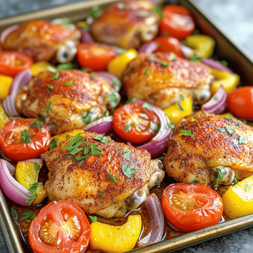 Slide the sheet pan into your preheated oven. Roast for 30-35 minutes. Use a meat thermometer to check if the chicken is done. It should reach 165°F (74°C). If you want crispy skin, turn on the broiler for the last 2-3 minutes. Keep a close watch to avoid burning. After cooking, let it rest for 5 minutes. Garnish with fresh parsley before serving.
