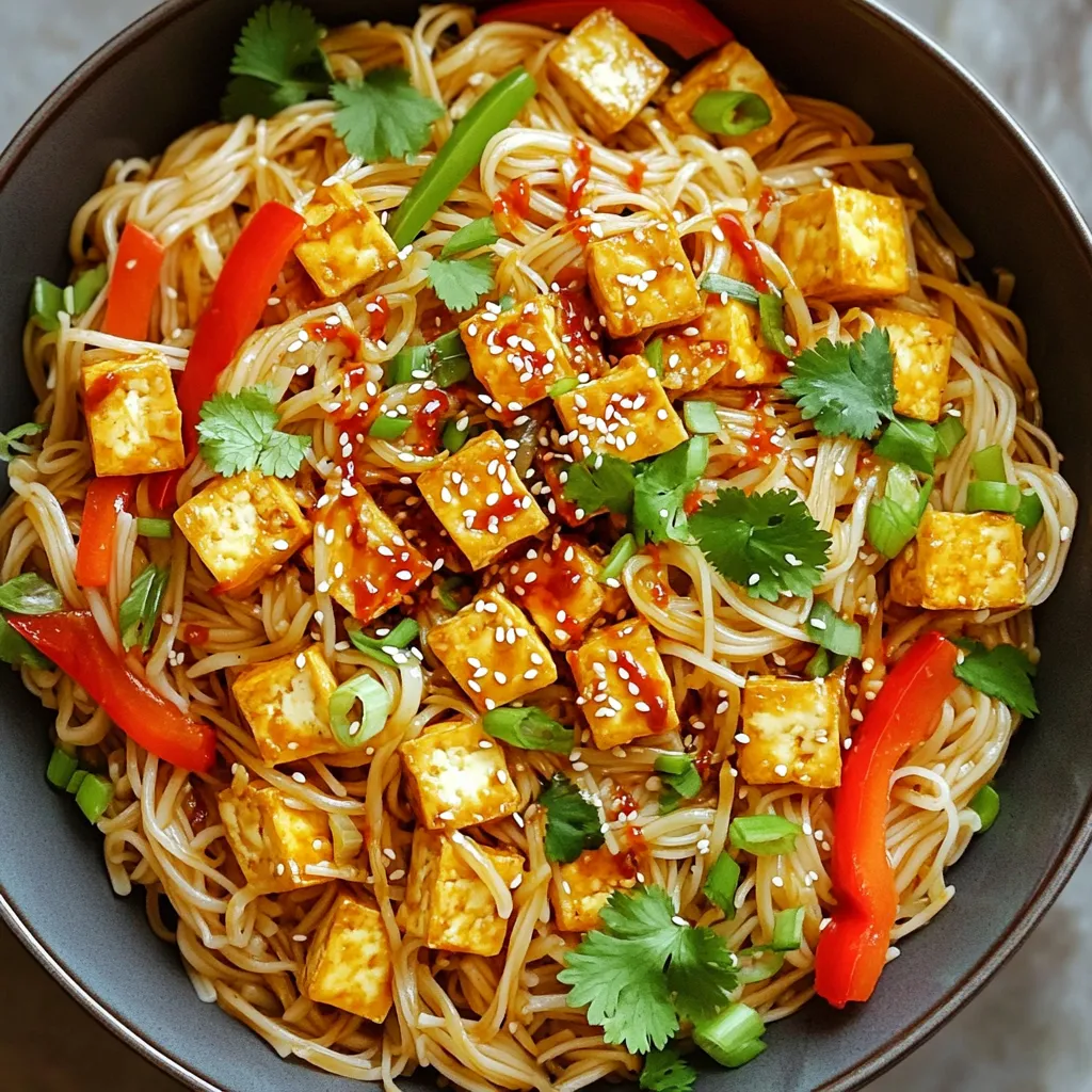 - 200g rice noodles - 250g firm tofu, cubed - 3 tablespoons chili oil - 2 tablespoons soy sauce - 1 tablespoon sesame oil - 1 tablespoon rice vinegar - 2 garlic cloves, minced - 1-inch piece of ginger, minced - 1 red bell pepper, thinly sliced - 2 green onions, chopped - 1 tablespoon sesame seeds - Fresh cilantro for garnish Gather these ingredients before you start cooking. The rice noodles give a nice base for this meal. The firm tofu adds protein and texture. Chili oil brings the heat and flavor. Each seasoning ingredient plays a role, too. Soy sauce gives depth. Sesame oil adds a nutty taste. Rice vinegar brings a slight tang. Use garlic and ginger for an aromatic boost. The red bell pepper adds color and sweetness. Green onions, sesame seeds, and fresh cilantro make the dish beautiful and fresh. Make sure to have everything ready. This makes the cooking process smooth and fun. Enjoy the vibrant flavors as they come together! - Cook 200g of rice noodles according to package instructions. - Drain the noodles and set them aside. - Heat 1 tablespoon of chili oil in a large non-stick skillet over medium-high heat. - Add 250g of cubed firm tofu. Sauté until golden brown and crispy on all sides. This takes about 8-10 minutes. - Season with salt and pepper. Once done, remove the tofu and place it on a plate. - In the same skillet, add another tablespoon of chili oil. - Sauté 2 minced garlic cloves and 1 inch of minced ginger until you smell their lovely aroma, roughly 1 minute. - Next, add 1 thinly sliced red bell pepper. Cook for 2-3 minutes until it’s slightly soft. - In a bowl, whisk together 2 tablespoons of soy sauce, 1 tablespoon of sesame oil, 1 tablespoon of rice vinegar, and 1 tablespoon of brown sugar. - Pour this sauce over the sautéed garlic, ginger, and bell pepper. Stir well to mix. - Gently add in the cooked rice noodles and crispy tofu. Toss everything together until the noodles are coated well with the sauce, about 2-3 minutes. - Sprinkle with sesame seeds and chopped green onions. Mix again to spread them evenly. - Remove from heat and garnish with fresh cilantro before serving. Tofu can be tricky, but I have some tips to help you out. First, to get that perfect crispiness, make sure to drain the tofu well. Press it between paper towels to remove extra moisture. This helps the tofu brown nicely. Cook it in a non-stick pan with hot chili oil for a golden, crispy finish. For marinating, you can use simple ingredients. Just mix soy sauce, ginger, and garlic. Let the tofu soak in this mix for 15 minutes. This adds great flavor to your dish. Want to make your dish even better? Try adding more veggies. Broccoli, snap peas, or even carrots work great. Just sauté them until they're bright and tender. If you love heat, throw in some extra chili flakes. Just a pinch can really amp up the spice level. Adjust it to your taste, and you’ll have a dish that’s bursting with flavor. Presentation matters! Serve your noodles in a deep bowl. Top them with more green onions and fresh cilantro. A drizzle of chili oil on top adds a nice touch. For sides, I recommend a light salad or spring rolls. They pair well with the noodles and balance the meal. A cold drink, like iced tea or lemonade, also works great. Enjoy your meal! {{image_2}} You can switch up the protein in this dish. If you prefer chicken or shrimp, they work well too. For chicken, use cooked, shredded breast meat. For shrimp, sauté them until pink and tender. Both options add a nice twist. If you want to keep it vegan, try different tofu types. Silken tofu gives a creamy texture. Marinated tofu adds more flavor. You can also use tempeh or seitan for a hearty bite. Rice noodles are great, but you can use other noodles. Egg noodles add richness and chewiness. Zucchini noodles are a fresh, low-carb choice. They soak up flavors well and keep the dish light. If gluten is a concern, try gluten-free noodles. Options like rice or quinoa noodles fit perfectly. They will still hold the sauce and taste great. Adjust the spice to your taste. If you want it less spicy, cut back on chili oil. You can also add more brown sugar for sweetness. This balance makes the dish appealing to everyone. You can mix in different sauces too. Try hoisin sauce for a sweet and savory kick. Or add a splash of lime juice for brightness. Experiment with spices like cumin or paprika for unique flavors. To store leftovers, place them in an airtight container. This keeps the flavors fresh. You can refrigerate them for up to three days. Make sure they cool down before sealing. For long-term storage, you can freeze the noodles and tofu. Spread them out on a baking sheet first. After they freeze, transfer them to a freezer-safe bag. This method prevents them from sticking together. You can keep them frozen for up to three months. The best way to reheat these noodles is in a skillet. Heat a little oil over medium heat. Add the noodles and tofu to warm them through. Stir them gently to avoid breaking the tofu. You can also use a microwave. Place them in a bowl with a splash of water. Cover it with a lid or a damp paper towel. Heat in short bursts, stirring in between. This keeps the noodles from becoming dry. Stored leftovers last about three days in the fridge. If you notice any mold or off smells, it's best to throw them out. Signs of spoilage include a slimy texture or an odd color. If you freeze them, check for freezer burn after a few months. If there are ice crystals, the quality may have dropped. Always trust your senses when checking for spoilage. Cook rice noodles for about 6 to 8 minutes. Start by boiling water in a pot. Add the noodles and stir gently. Check them around 5 minutes for doneness. They should be soft but not mushy. Drain the noodles and rinse them with cold water to stop the cooking. Yes, you can make it gluten-free! Replace soy sauce with tamari, a gluten-free option. Make sure the chili oil and rice vinegar are also gluten-free. Check the