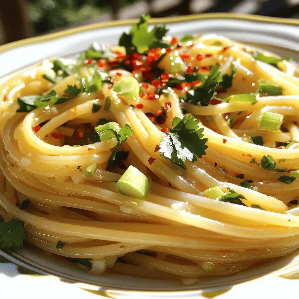 Now it’s time to add the cooked noodles to the skillet. Toss them gently to coat them in the garlic oil. Pour in 1 tablespoon of soy sauce and 1 tablespoon of sesame oil. Mix everything well! Add a little of the reserved pasta water, a bit at a time, until you reach your desired sauce consistency. Be careful with salt because the soy sauce adds a salty flavor. Lastly, turn off the heat and stir in 1/4 cup of chopped scallions and 1/4 cup of fresh cilantro. If you want a zesty kick, add 1 tablespoon of lime juice. Serve the noodles hot, and enjoy your flavorful dish!