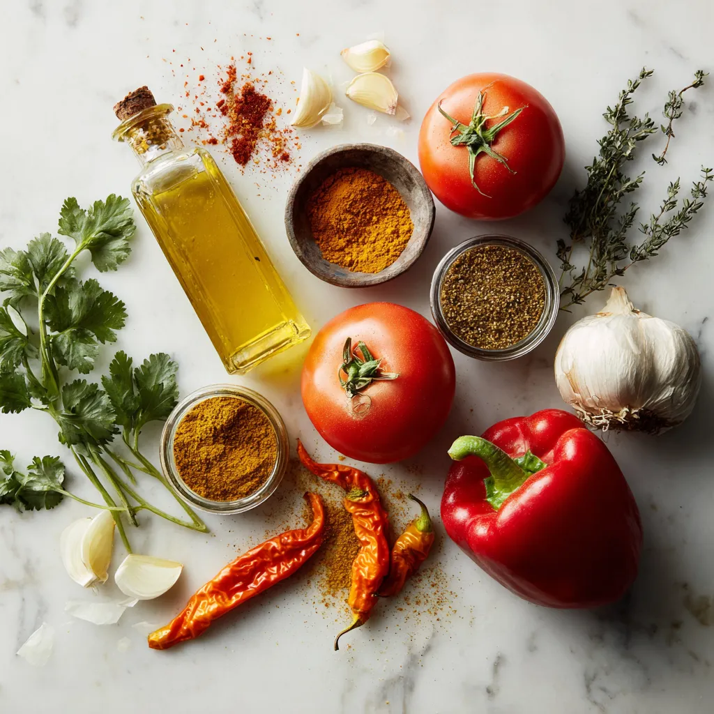 – Gather your ingredients: chicken, tomatoes, peppers, onion, garlic, ginger, and spices.