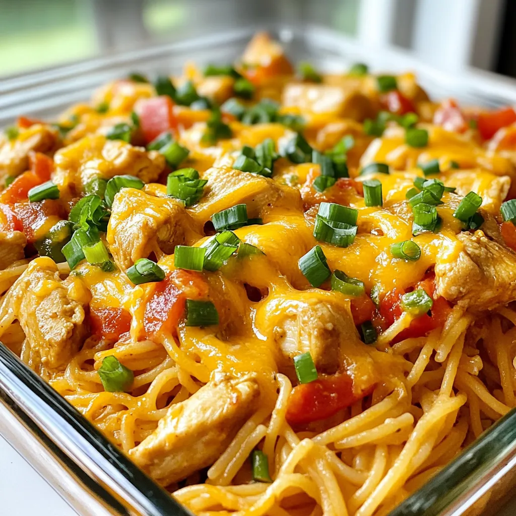 Serve and garnish: Plate the chicken spaghetti, and garnish with sliced green onions for an extra burst of flavor and color.