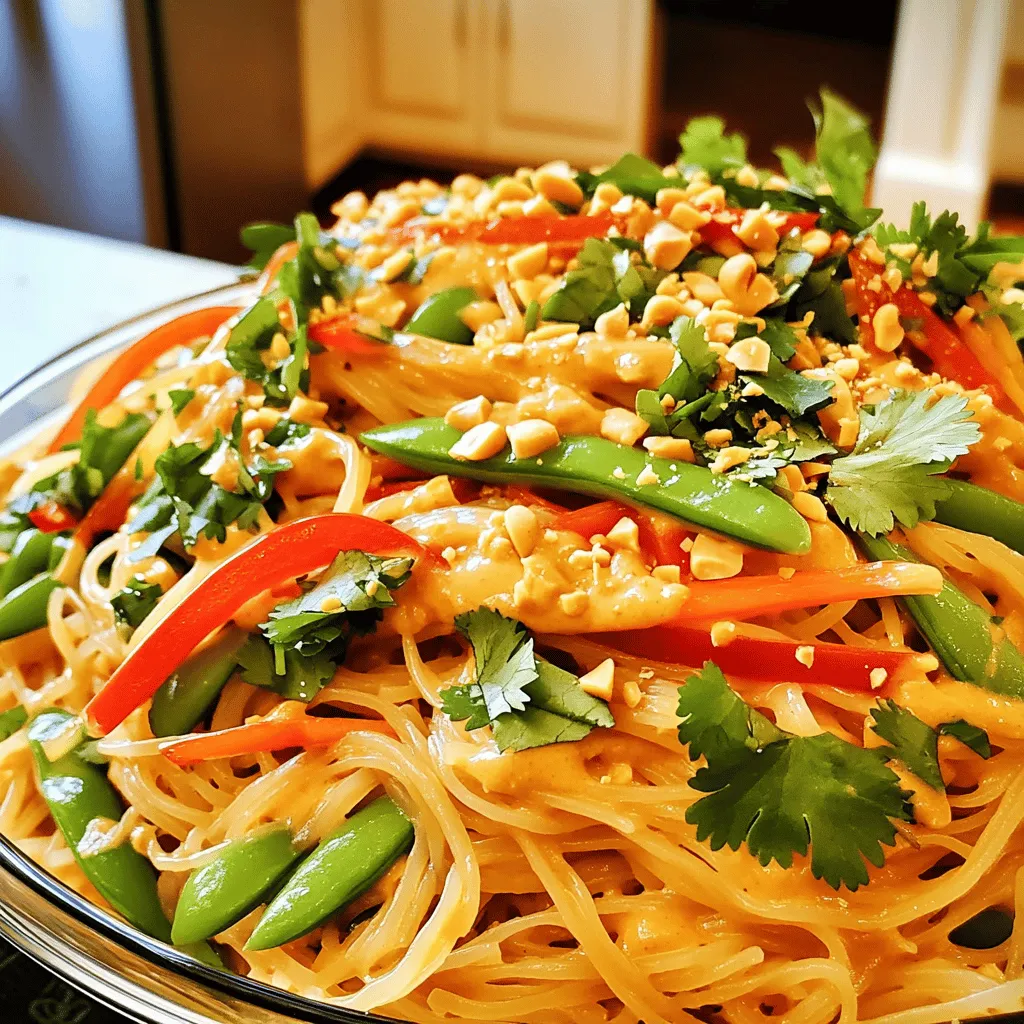 - 8 oz rice noodles - 1 cup snap peas, trimmed - 1 red bell pepper, thinly sliced - 1 carrot, julienned - 3 green onions, chopped - 1/4 cup creamy peanut butter - 2 tablespoons soy sauce (or tamari for gluten-free) - 1 tablespoon fresh lime juice - 1 tablespoon sriracha (adjust to taste) - 1 teaspoon sesame oil - 1 tablespoon honey or maple syrup - Crushed peanuts and cilantro, for garnish Gather these ingredients for a tasty dish. Rice noodles are the base. They soak up all the flavors. Snap peas add crunch, while red bell pepper and carrot bring color. Green onions give a fresh bite. The peanut sauce is the star here. Creamy peanut butter pairs with soy sauce for saltiness. Fresh lime juice adds brightness, and sriracha brings heat. Sesame oil adds depth, and honey or maple syrup balances the spice. These ingredients let you create a flavorful meal. Each item plays a role. You can also adjust flavors to fit your taste. Start by boiling a large pot of water. Add the rice noodles when the water is rolling. Cook them for about 6-8 minutes, or until they are al dente. When done, drain the noodles and rinse them under cold water. This stops the cooking and keeps them from sticking. Set your noodles aside for later. While the noodles cook, heat a large skillet over medium-high heat. Add a splash of water to the skillet. Toss in the snap peas, red bell pepper, and carrot. Sauté these colorful veggies for around 3-4 minutes. You want them bright and just tender. Next, add the chopped green onions and cook for one more minute. This adds a nice crunch to your dish. In a medium bowl, combine the creamy peanut butter, soy sauce, fresh lime juice, sriracha, sesame oil, and honey. Whisk these ingredients together until smooth. If the sauce feels too thick, add a little water. Keep whisking until you achieve your desired consistency. This sauce makes the dish flavorful and rich. Now it’s time to bring everything together. Add the cooked noodles to the skillet with the sautéed vegetables. Pour the peanut sauce over the top. Mix everything gently to coat the noodles and veggies well. Heat the dish for another 2-3 minutes. This warms everything nicely and allows the flavors to blend. When ready, serve the noodles warm. Top each plate with crushed peanuts and fresh cilantro. This adds a nice crunch and fresh flavor to the dish. Enjoy your meal at a warm temperature for the best taste! To make perfect rice noodles, start with boiling water. Follow the package instructions for cooking time. It usually takes about 5-7 minutes. You want them to be al dente, or firm to the bite. After cooking, drain the noodles and rinse them under cold water. This stops the cooking process and keeps them from sticking. Make sure to rinse well; it helps remove extra starch. You can adjust the spice in the peanut sauce to fit your taste. If you like it mild, use less sriracha. For more heat, add a bit more. Taste the sauce as you mix it to find your perfect balance. Feel free to substitute ingredients in the peanut sauce. If you don’t have honey, use maple syrup. You can also swap soy sauce with tamari for a gluten-free option. To boost the flavor of your dish, add extra seasonings. A pinch of garlic powder or ginger can work wonders. You could also sprinkle some crushed red pepper flakes for added heat. Don’t forget about garnishes! Fresh cilantro adds bright flavor, while crushed peanuts give a nice crunch. You could also add lime wedges for an extra zing when serving. {{image_2}} You can easily change the protein in your spicy Thai peanut noodles. Adding cooked chicken gives the dish a hearty touch. Grilled shrimp adds a fresh twist, while tofu makes it a great vegan option. If you want a vegetarian dish, just stick with tofu or add more veggies. Feel free to swap vegetables based on what you have. If snap peas are out of season, try using broccoli or bell peppers. Zucchini works well, too! Carrots can be replaced with thinly sliced radishes for a different crunch. The goal is to keep it colorful and fresh. For gluten-free options, use rice noodles and tamari instead of soy sauce. Rice noodles are naturally gluten-free and easy to cook. Tamari adds the same great flavor without gluten. Check the labels to ensure everything fits your dietary needs. To store your spicy Thai peanut noodles, place them in an airtight container. This keeps them fresh and tasty. They last in the fridge for about 3 to 4 days. If you notice any unusual smell or mold, it’s best to throw them out. Yes, you can freeze spicy Thai peanut noodles! To freeze, place them in a freezer-safe container. Use it within 1 to 2 months for the best flavor. When you're ready to eat, thaw them overnight in the fridge. This helps maintain taste and texture. To reheat without drying out, add a splash of water or broth. Heat in a pan over medium-low heat. Stir often to mix in the moisture. You can also use a microwave. Cover with a damp paper towel to keep them moist. Enjoy your leftovers just as much as the first time! Spicy Thai Peanut Noodles are a delightful dish made with rice noodles. Fresh vegetables like snap peas, red bell peppers, and carrots add color and crunch. The creamy peanut sauce ties everything together. This sauce mixes peanut butter, soy sauce, lime juice, and sriracha for a spicy kick. It’s a quick and tasty meal that pleases many palates. Yes, you can make this dish in advance. Cook the noodles and vegetables, then store them separately. Keep the peanut sauce in a jar. When you're ready to eat, combine everything and heat it up. This way, you save time and still enjoy fresh flavors. Meal prep makes busy days easier. To adjust the spice level, start with less sriracha. You can always add more later. For mild noodles, use one teaspoon. For medium, two teaspoons work well. If you love heat, go for three or four teaspoons. Taste as you go to find your perfect match. Look for Thai restaurants or Asian bistros to find Spicy Thai Peanut Noodl