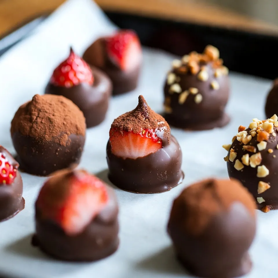 After the strawberry cream has chilled, I remove it from the fridge. I use a small spoon or a piping bag to scoop small dollops of the cream onto a parchment-lined baking sheet. I freeze these dollops for about 15 to 20 minutes until they are firm. Once they are ready, I dip each dollop into the melted dark chocolate. I make sure each one is fully coated. Using a fork, I lift them out and tap off the excess chocolate. If I want, I can roll them in cocoa powder or crushed nuts for extra texture. Finally, I place the coated chocolates back on the parchment paper. I let them set at room temperature or return them to the fridge for quicker setting. Once set, they are ready to enjoy!