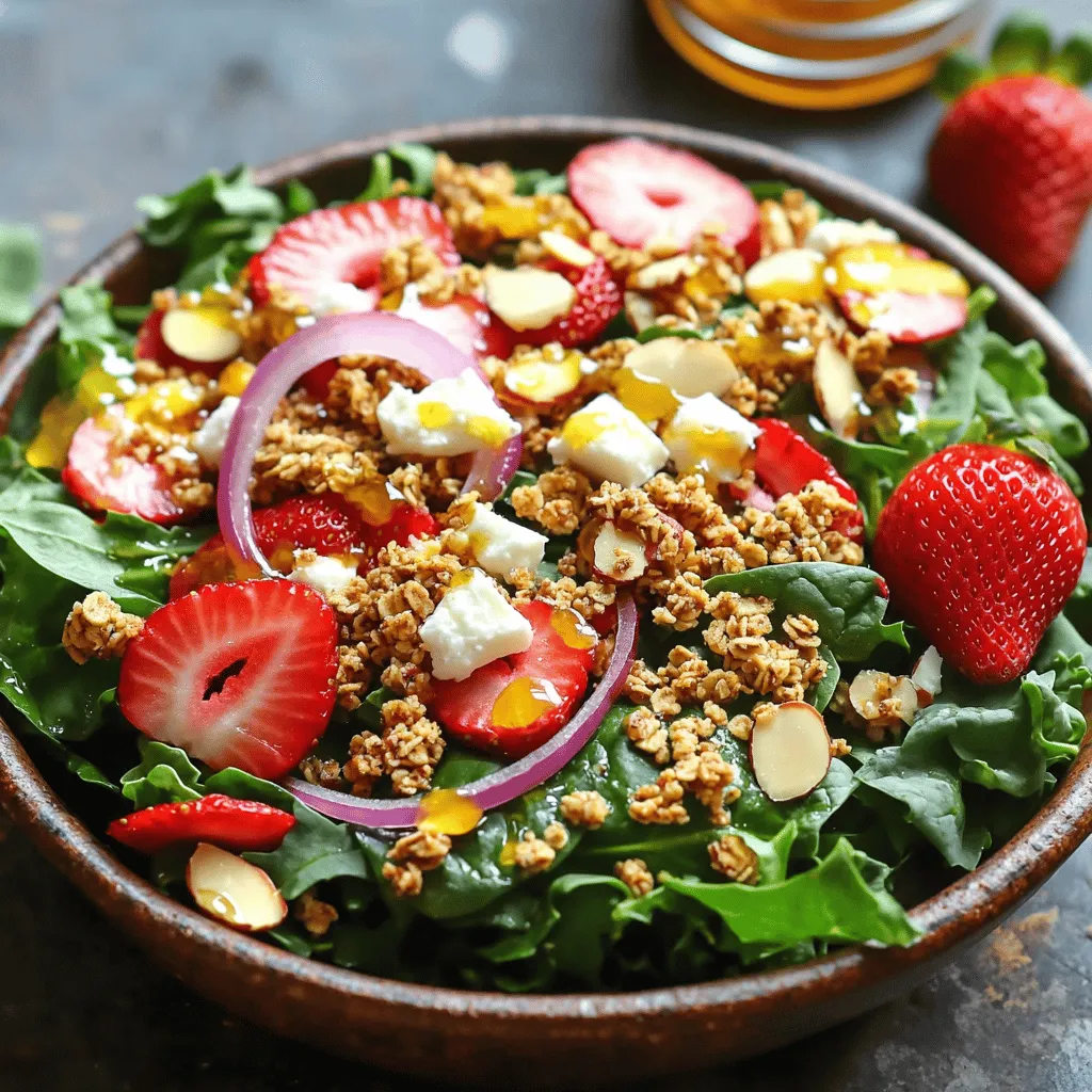 Make your salad shine with a beautiful presentation. Serve it in a large bowl for family style, or on individual plates. To add flair, place an extra strawberry on top of each serving. You can drizzle a bit of vinaigrette on the side for a nice touch. This looks great and lets everyone add their own dressing. For added crunch, sprinkle some extra granola just before serving.