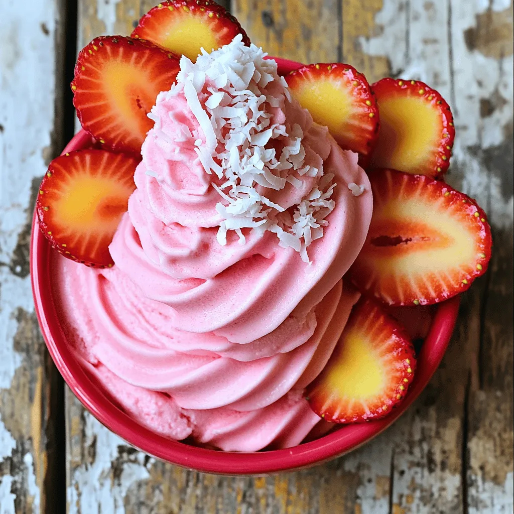 To make a yummy Strawberry Dole Whip, you need just a few simple items: - 2 cups frozen strawberries - 1 cup canned coconut milk - 1 tablespoon honey or agave syrup (adjust for sweetness) - 1 teaspoon vanilla extract - A pinch of salt These ingredients come together to create a creamy, fruity delight. The frozen strawberries give it a sweet and tangy flavor, while coconut milk adds richness. Honey or agave syrup sweetens the mix just right. Adding toppings can make your Strawberry Dole Whip even more special. Here are some fun ideas: - Fresh strawberry slices - Shredded coconut - Mint leaves - Chocolate chips or sprinkles These toppings offer extra flavor and nice textures. You can mix and match to find your favorite! If you don’t have some ingredients, don’t worry! Here are some swaps you can try: - Use fresh strawberries instead of frozen, but add ice to keep it cold. - Swap coconut milk for almond or soy milk for a different flavor. - Use maple syrup in place of honey or agave syrup for a unique taste. These substitutes keep the recipe easy and fun, allowing you to enjoy your treat no matter what! Check out the Full Recipe for more details. To make Strawberry Dole Whip, gather your ingredients first. You need 2 cups of frozen strawberries, 1 cup of canned coconut milk, 1 tablespoon of honey or agave syrup, 1 teaspoon of vanilla extract, and a pinch of salt. 1. Start by adding the frozen strawberries and coconut milk into a blender. 2. Next, add the honey (or agave), vanilla extract, and the salt. 3. Blend on high speed until the mix is smooth and creamy. You may need to stop and scrape down the sides to ensure everything blends well. If your mixture is too thick, don’t worry! Just add more coconut milk, a tablespoon at a time. Blend again until you reach the right consistency. Aim for a soft-serve texture. This makes it easier to pipe into bowls. Also, if your blender struggles, try cutting the frozen strawberries into smaller pieces. This helps the blender work better and makes blending faster. Once your Strawberry Dole Whip is ready, it’s time to serve! Use a piping bag or a zip-top bag with one corner cut off. Pipe the creamy mix into bowls or cups in a swirling motion. This creates a fun and inviting look. For added flair, top your Dole Whip with fresh strawberry slices, shredded coconut, or a mint leaf. Serve right away for the best taste and texture. Enjoy this refreshing treat with family and friends on a hot summer day! To get the best texture for your Strawberry Dole Whip, blend well. Start with frozen strawberries and coconut milk. Blend until smooth. If it's too thick, add more coconut milk. Do this slowly, one tablespoon at a time. You want it creamy but not runny. Use a piping bag for fun shapes. This method gives you that classic soft-serve look. Sweetness is key in a good Dole Whip. I recommend starting with one tablespoon of honey or agave syrup. Taste the mixture as you blend. If it's not sweet enough, add more honey. Remember, fresh strawberries can vary in sweetness. Adjust to your taste for the best experience. If your Dole Whip doesn't come out right, don’t worry. Here are common problems and fixes: - Too Thick: Add a bit more coconut milk and blend again. - Too Sweet: Mix in a tiny pinch of salt to balance the flavors. - Not Smooth: Blend longer and scrape down the sides of the blender. These tips will help you create a delightful treat every time. For a full guide, check the Full Recipe. {{image_2}} To make a vegan version of Strawberry Dole Whip, stick with the main ingredients. The recipe already uses coconut milk, which is plant-based. You can swap honey with agave syrup for a fully vegan treat. This small change makes a big difference for those who avoid animal products. Enjoy a creamy, fruity delight that fits your vegan lifestyle. If you want a dairy-free treat, this recipe is perfect. Coconut milk provides a rich, creamy base without any dairy. You can also use almond or oat milk as a substitute. Just keep in mind that these options may change the flavor slightly. Stick to the original recipe or substitute wisely to keep it smooth and tasty. Want to mix things up? You can add other fruits to your Strawberry Dole Whip. Try blending in bananas for a creamier texture. You can also add a splash of lime or lemon juice for a tart twist. If you like chocolate, mix in some cocoa powder or chocolate chips. Get creative with your flavors to find your favorite combo. For more ideas, check the Full Recipe to inspire your next creation! To keep your Strawberry Dole Whip fresh, store it in an airtight container. This helps prevent ice crystals from forming. You can also use a zip-top bag; just squeeze out the air before sealing. Keep it in the freezer for the best texture and flavor. If you want to enjoy it later, consider dividing it into smaller portions. This way, you can take out just what you need. Dole Whip is best served cold, so reheating is not recommended. If it becomes too hard, let it sit at room temperature for about 5 minutes. This softens it enough to scoop and enjoy. Avoid using the microwave, as it changes the texture. You want that smooth and creamy delight! Strawberry Dole Whip can last up to two weeks in the freezer. However, for the best taste, enjoy it within a week. If you freeze it longer, it may lose some flavor. Always check for any odd smells or changes in texture before serving. For a quick treat, consider making a big batch and storing it. You’ll have a refreshing dessert ready whenever you want. If you want to explore more, check out the Full Recipe for other tips. Strawberry Dole Whip is a creamy and fruity dessert. It has just a few simple ingredients. You need: - 2 cups frozen strawberries - 1 cup canned coconut milk - 1 tablespoon honey or agave syrup - 1 teaspoon vanilla extract - A pinch of salt These ingredients blend together to create a smooth, rich treat. The frozen strawberries give it a vibrant color and sweet taste