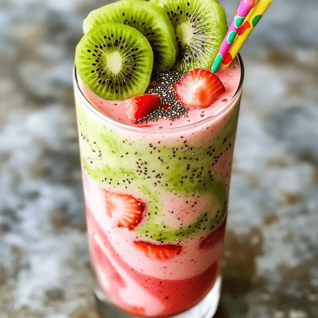 ![- 1 cup fresh strawberries, hulled and halved - 2 ripe kiwis, peeled and sliced - 1 banana, frozen - 1 cup plain Greek yogurt - 1 tablespoon honey or agave syrup (optional) The main ingredients are simple and fresh. Fresh strawberries give a sweet and tangy taste. Ripe kiwis add a unique flavor and vibrant color. The frozen banana makes the smoothie creamy and thick. Greek yogurt adds protein and richness. Honey or agave syrup sweetens the drink, but it is optional. - 1 tablespoon chia seeds for nutrition - Ice cubes for a thicker consistency - Alternative milk options (like almond or oat milk) You can add chia seeds for extra nutrition. They are great for fiber and omega-3s. Ice cubes help make the smoothie colder and thicker. You can also swap regular milk for any nut or plant-based milk. - Servings: 2 - Adjusting ingredient quantities for larger batches This recipe serves two people. If you need more, just double the ingredients. You can easily adjust the amounts to fit your needs. Enjoy this refreshing drink any time of the day! Check out the Full Recipe for more details. To start, you need to prepare your fruits. First, wash the strawberries. Remove the green tops, also called hulls. Cut the strawberries in half to make them easier to blend. Next, take the ripe kiwis. Peel them with a knife, then slice them into rounds. If you want, you can also cut them into smaller pieces. Lastly, grab your banana. If it's not frozen yet, peel it and put it in the freezer for a few hours. Now it's time to blend. In your blender, add the prepared strawberries, kiwis, and the frozen banana. Then, pour in the plain Greek yogurt and the almond milk. If you like it sweeter, drizzle in honey or agave syrup. Blend everything on high speed until the mixture is smooth and creamy. This usually takes about 30 seconds. You can stop and scrape down the sides if needed. If you want a colder smoothie, toss in a few ice cubes and blend again. After blending, taste your smoothie. If it's not sweet enough, add more honey or agave syrup. Blend again briefly to combine. For serving, pour the smoothie into glasses. To make it look pretty, you can garnish with a slice of kiwi or some halved strawberries on top. A sprinkle of chia seeds or a mint leaf adds a nice touch too. Serve with colorful straws for fun! You can find the [Full Recipe] to follow along easily. To make your smoothie nice and creamy, I always use frozen bananas. They add a rich texture. Plus, they cool down the drink without needing extra ice. If you want to change the milk, try almond, oat, or coconut milk. Each milk gives a different taste. Almond milk adds a nutty flavor, while coconut milk gives a tropical twist. You can add fun flavors to your smoothie. A splash of vanilla extract works great. It gives a sweet and warm taste. You can also mix in other fruits. Berries or mango will add color and flavor. Just remember to balance the sweetness. Experiment and find what you love! Strawberries and kiwis pack a lot of nutrients. Strawberries are rich in vitamin C. They help boost your immune system. Kiwis are great for digestion and have lots of fiber. Using Greek yogurt adds protein to your drink. It makes you feel full and helps with muscle repair. This smoothie is not just tasty; it is healthy too! Want to make it? Check out the Full Recipe. {{image_2}} If you want a dairy-free version, try using coconut yogurt. This yogurt adds a creamy texture and a hint of tropical flavor. It pairs wonderfully with strawberries and kiwis. For a milk alternative, you can use oat milk or soy milk. Both options work well, keeping your smoothie smooth and tasty. To add a healthy green twist, include a handful of spinach or kale. These greens blend well and boost nutrients. To balance the flavor, squeeze in some lemon or lime juice. The citrus adds brightness and enhances the fruity taste of the strawberries and kiwis. For an extra protein kick, mix in a scoop of protein powder. This makes your smoothie more filling and is great post-workout. You can also add nut butter, like almond or peanut butter. This addition gives a rich flavor and healthy fats. Feel free to explore these variations for your Strawberry Kiwi Yogurt Smoothie. Each change brings a new taste and experience. You can find the full recipe [Full Recipe]. To keep your smoothie fresh, refrigerate it right away. It lasts 1-2 days in the fridge. Just remember to shake or stir it before drinking. If you want to enjoy it later, freezing is a great option. Pour leftover smoothie into ice cube trays. Once frozen, transfer the cubes to a bag. This way, you can blend them into a new smoothie later. When storing your smoothie, choose the right container. Glass jars are great because they do not absorb odors. They also keep flavors fresh. Plastic bottles are lighter but may not prevent oxidation as well. To minimize oxidation, fill your container to the top. This reduces air space and keeps your smoothie tasting great. Don't let leftover fruits go to waste! Use them in other recipes. You can mix fruits into oatmeal or bake them in muffins. You can also make another smoothie with different fruits. Try blending the leftover strawberries or kiwis with other flavors. Check out the Full Recipe for more ideas on how to enjoy your smoothie. Yes, you can use frozen strawberries or kiwis in this smoothie. Frozen fruit gives you a chill factor. It can make your drink cold and thick. Plus, using frozen fruit means less prep work. You don't have to wash or slice them. They also last longer, so you reduce waste. Frozen fruit keeps all the good nutrients too. To make this smoothie vegan, swap out Greek yogurt for coconut yogurt. You can also use almond milk or oat milk. For sweetness, use maple syrup instead of honey. These simple changes keep the taste yummy while fitting your diet. Pair this smoothie with a few tasty sides. Try whole-grain toast with avocado. You can also enjoy some granola or nuts. A light salad with greens 