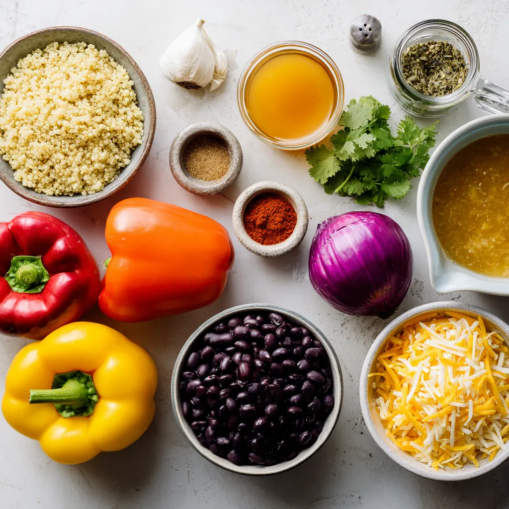 The main ingredients are simple and tasty. You need large bell peppers, which can be any color you like. Red, yellow, and green all work well. They are sweet and colorful. Next, you will use quinoa, a great grain that cooks fluffy and has a nice bite. You will also need vegetable broth. It gives the quinoa a great flavor.