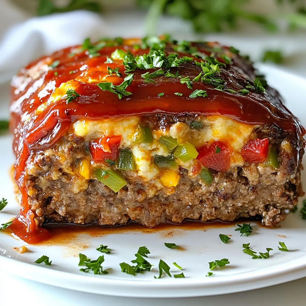 A delicious meatloaf filled with cheese and vegetables, perfect for a hearty meal.