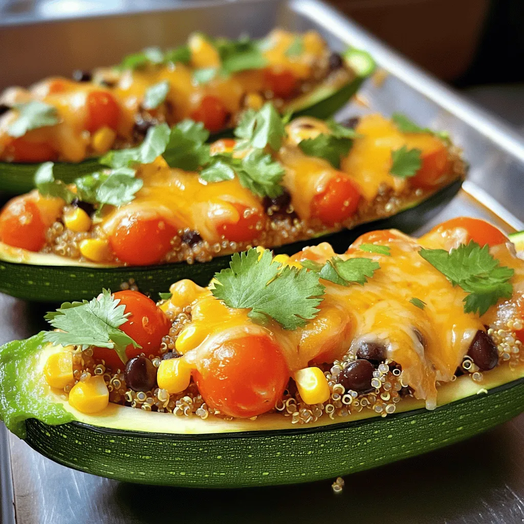 To make stuffed zucchini boats, gather these key ingredients: - 4 medium zucchini - 1 cup cooked quinoa - 1 cup cherry tomatoes, halved - 1/2 cup corn kernels (fresh or frozen) - 1/2 cup black beans, rinsed and drained - 1/4 cup red onion, finely chopped - 1 teaspoon cumin - 1 teaspoon smoked paprika - Salt and pepper to taste - 1/2 cup shredded cheese (cheddar or a blend) - Fresh cilantro, for garnish These ingredients create a delicious and healthy dish. The quinoa is a great base, adding texture and protein. The zucchini acts as a perfect vessel for all the flavors. You can change this recipe to fit your taste. Here are some ideas: - Bell peppers for extra crunch - Spinach for added nutrients - Different beans, like pinto or chickpeas - Spices such as chili powder or garlic powder - Different types of cheese like feta or mozzarella Feel free to mix and match these options. Customizing your filling makes this dish even more fun! Having the right tools helps make cooking easier. Here’s what you need: - A sharp knife for cutting - A spoon for scooping out the zucchini - A skillet for cooking the filling - A baking sheet for the zucchini boats - An oven for baking These simple tools will help you create a beautiful dish. With the right setup, you’ll enjoy making stuffed zucchini boats! For the full recipe, check the provided link and get started! First, preheat your oven to 375°F (190°C). This helps the zucchini cook just right. Next, take your medium zucchinis and cut them in half lengthwise. Use a spoon to scoop out the seeds and create boats. Save the flesh you scoop out; it adds great flavor to your filling. In a skillet over medium heat, add a splash of olive oil. Then, add the finely chopped red onion. Sauté it for about 3-4 minutes until it turns soft. Now, chop the reserved zucchini flesh and add it to the skillet. Toss in halved cherry tomatoes, corn, black beans, cumin, smoked paprika, salt, and pepper. Cook this mixture for about 5 minutes. You want the tomatoes to soften a bit. Finally, stir in 1 cup of cooked quinoa until everything is mixed well. Place your zucchini boats on a baking sheet. Spoon the filling into each boat generously. Don’t be shy; pack it in! Top each filled boat with shredded cheese. Bake them in your preheated oven for 20-25 minutes. Look for tender zucchini and bubbly, golden cheese. Once done, take them out and let them cool for a few minutes. Garnish with fresh cilantro before serving. For the complete recipe, check out the link to the [Full Recipe]. To cook zucchini so it stays tender, start with fresh ones. Look for firm, medium-sized zucchini. Cut them in half lengthwise to make boats. Use a spoon to scoop out the seeds gently. This creates space for the filling. Bake them at 375°F (190°C) for 20-25 minutes. This method keeps them soft without turning mushy. You can mix and match fillings to suit your taste. The base recipe uses quinoa, beans, and veggies. You can add other ingredients like sausage or mushrooms. If you want a spicy kick, add jalapeños or hot sauce. For a creamier texture, try cream cheese or sour cream in the filling. Always taste your mix and adjust spices as needed. This way, you ensure it suits your palate. Serve stuffed zucchini boats with a fresh salad or rice. A side of garlic bread complements the dish well. For a complete meal, pair them with grilled chicken or fish. You can also top them with extra cheese or fresh herbs for added flavor. Consider a drizzle of balsamic glaze for a sweet touch. These options make your meal more exciting and balanced. For the full recipe, check out Stuffed Zucchini Boats . {{image_2}} For a tasty vegetarian option, you can change the filling. Try adding mushrooms, bell peppers, or spinach. You can also use brown rice or couscous instead of quinoa. Another idea is to mix in some feta cheese for a salty kick. This adds great flavor and texture. To make these zucchini boats vegan, simply skip the cheese. You can use nutritional yeast for a cheesy flavor without dairy. For the filling, add lentils or chickpeas for a hearty bite. Swap out any animal products and focus on fresh veggies. This makes the dish healthy and satisfying. If you want more protein, ground turkey or chicken works well. Brown the meat before adding it to the filling mix. You can also use tofu or tempeh for a plant-based option. Just crumble and sauté it with the veggies. These additions make the dish more filling and delicious. For the full recipe, check out the link! Store leftover stuffed zucchini boats in an airtight container. Keep them in the fridge for up to four days. Make sure they cool down before sealing them. This helps keep the flavor fresh and tasty. To reheat, place the zucchini boats on a baking sheet. Preheat your oven to 350°F (175°C). Heat them for about 15-20 minutes. This method warms the filling and keeps the zucchini tender. You can also use the microwave for a quick method. Heat for one to two minutes, but the oven gives the best results. You can freeze stuffed zucchini boats for later. First, let them cool completely. Wrap each boat in plastic wrap and then place them in a freezer bag. They can stay fresh for up to three months. To cook frozen zucchini, thaw them in the fridge overnight. Then, bake them at 350°F (175°C) until heated through. This keeps them tasty and ready for your next meal. For the full recipe, check out the link to make your own delicious stuffed zucchini boats! Yes, you can make stuffed zucchini boats ahead of time. Prepare the filling and stuff the zucchini boats. Cover them tightly with plastic wrap or foil. Store them in the fridge for up to 24 hours. When ready to cook, just bake them as directed in the full recipe. This saves time on busy days. You can get creative with your fillings! Some great options include: - Ground turkey or beef - Cooked rice or couscous - Spinach and feta cheese - Sauteed mushrooms and garlic - Lentils or chickpeas Feel free to mix and m