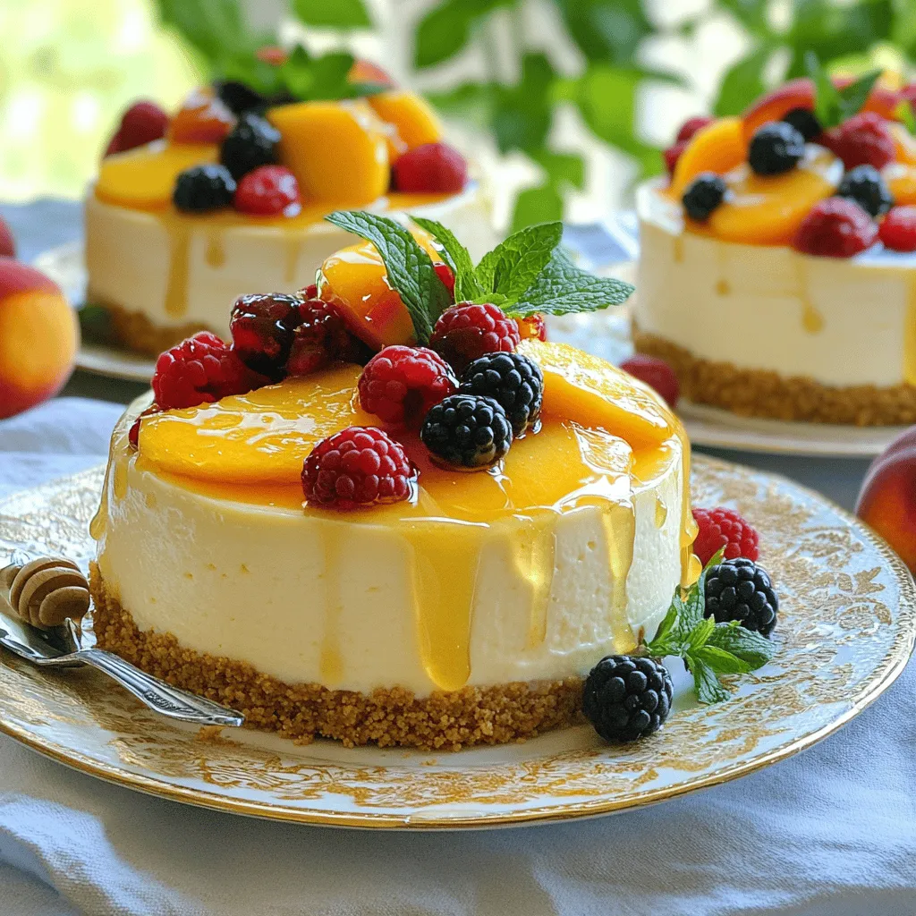 Each ingredient plays a key role in making this dessert creamy and sweet. The graham cracker crumbs form a tasty crust. The butter binds it all together. Cream cheese gives the cheesecake its rich and smooth texture. Sugar adds sweetness, while vanilla enhances the flavor. Eggs help set the cheesecake, and sour cream adds a tangy taste. Fresh peaches and berries bring a burst of fruity flavor. Finally, honey adds a touch of natural sweetness.You’ll see how these ingredients blend to create a delightful treat that captures the essence of summer.
