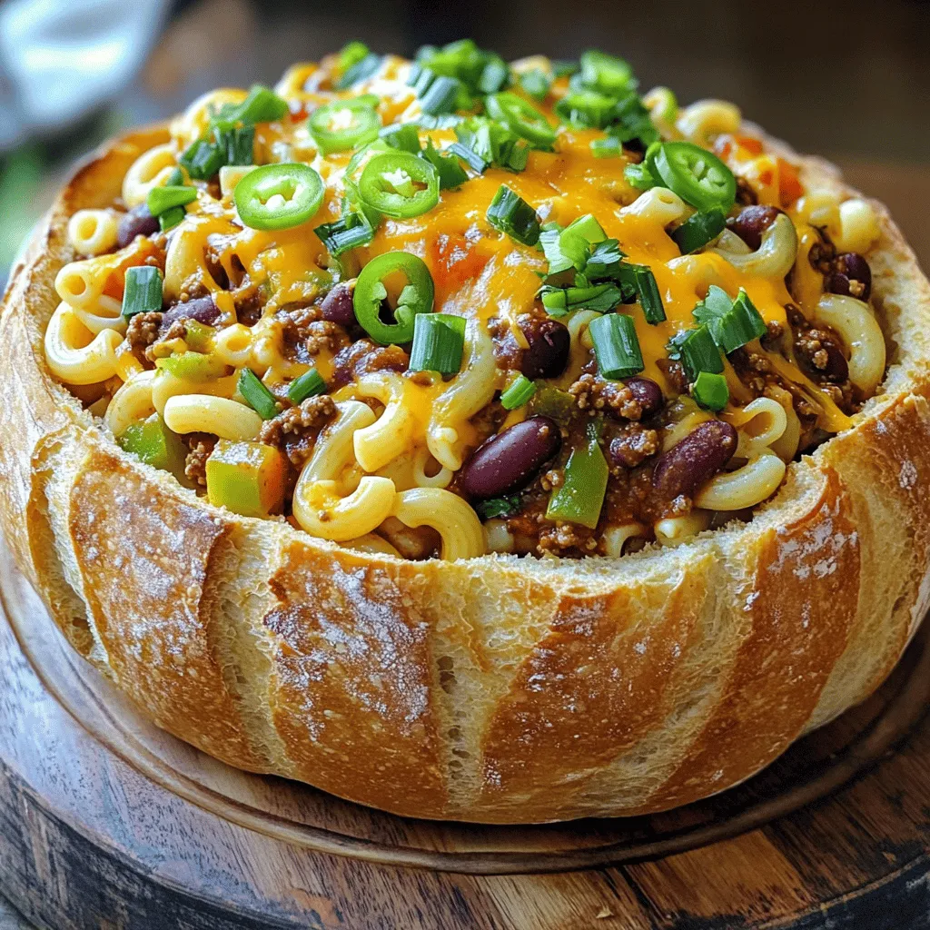 You can choose between vegetarian and meat-based chili for your Tailgate Chili Mac Bread Bowl. Vegetarian chili brings a hearty feel without meat. It usually features beans, tomatoes, and spices. Meat-based chili often includes ground beef or turkey, giving it a robust flavor. You can also mix beans to your taste. Try black beans, kidney beans, or pinto beans for extra texture and taste.