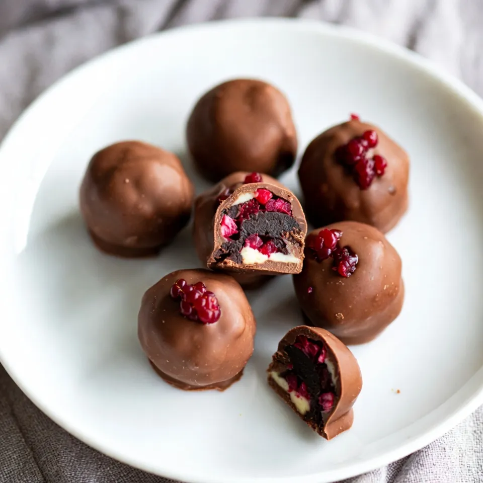 Delicious truffles made with fresh raspberries and dark chocolate.