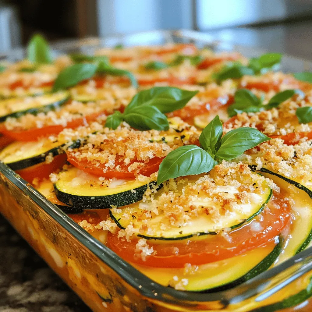 - 3 medium zucchinis - 4 large ripe tomatoes - 1 large onion - 3 cloves garlic - 1 cup shredded mozzarella cheese - 1 cup fresh basil leaves - 1 teaspoon dried oregano - ½ teaspoon red pepper flakes - ¼ cup olive oil - Salt and pepper - ½ cup breadcrumbs When I make this Tomato Zucchini Casserole, I find joy in simple, fresh ingredients. Each one plays a role in creating a dish that is both hearty and healthy. The zucchinis add a nice crunch, while the ripe tomatoes bring a burst of flavor. Each serving has about 250 calories. You get 15 grams of fat, 10 grams of carbs, and 8 grams of protein. This makes it a great meal for a light dinner. It offers a good balance of nutrients while staying low in calories. If you want to switch things up, try different cheeses. Feta or goat cheese can add a tangy kick. For veggies, you can use eggplant or bell peppers. Both can change the flavor in a fun way. For the full recipe, check the details above. Enjoy cooking! First, preheat your oven to 375°F (190°C). This step is key. If you skip it, your casserole won’t cook well. Next, prepare the vegetables. Slice the zucchinis into thin rounds. Use a sharp knife for even cuts. Slice the tomatoes and onion the same way. Mince the garlic too. In a large skillet, heat ¼ cup of olive oil over medium heat. Add the sliced onion and garlic. Sauté them for about 5-7 minutes until they are soft. This step builds great flavor. Now, grab a large baking dish. Start with the first layer. Arrange half of the sliced zucchinis in an even layer at the bottom. Next, layer half of the sliced tomatoes on top of the zucchinis. Sprinkle half of the sautéed onion and garlic mixture over the tomatoes. Season this layer with salt, pepper, half of the chopped basil, oregano, and red pepper flakes if you want some spice. Repeat these layers with the remaining zucchinis, tomatoes, onion, garlic, and seasonings. Finish the top layer with 1 cup of shredded mozzarella cheese. Then, sprinkle ½ cup of breadcrumbs over the cheese for a nice crunch. Cover the dish with foil. Bake it for 25-30 minutes. This keeps the moisture in. After that, remove the foil. Bake for another 15-20 minutes. You want the cheese to be bubbly and the top to be golden brown. Check for doneness by poking the casserole with a fork. If the veggies are tender, it’s ready. Let the casserole sit for about 5 minutes before serving. This helps the layers set. Garnish with extra fresh basil leaves for a pop of color. For the full recipe, refer to the complete guide. To get a creamy texture in your Tomato Zucchini Casserole, use fresh ingredients. Fresh zucchini and tomatoes work best. Layer the veggies tightly for a nice hold. You can add a splash of cream or milk if you like it extra creamy. For a crunchy topping, use breadcrumbs. Mix the breadcrumbs with olive oil and some grated cheese. This will give you a lovely golden crust. Bake it until the top is crisp and brown. Don’t skip this step; it makes the dish more fun! Adding herbs or spices can take your casserole to the next level. Fresh basil is a must; it brings out the best in tomatoes. You can also try thyme and rosemary for added depth. Suggested seasonings include oregano and red pepper flakes for some heat. Just a pinch of these will make your dish pop. Taste as you go, and adjust to your liking. Pair this casserole with a fresh salad or garlic bread. A light side dish balances the rich flavors. You can also serve it with grilled chicken for protein. For presentation, serve it in the baking dish for a rustic look. Garnish with extra fresh basil on top. This adds color and makes it inviting. Enjoy every bite of this savory dish! {{image_2}} To make the tomato zucchini casserole dairy-free, you can swap the mozzarella cheese for a plant-based cheese. Look for brands that melt well, so you still get that gooey texture. You can also use a mix of nutritional yeast and cashew cream for a creamy finish. For the shredded mozzarella, try these substitutes: - Vegan mozzarella cheese - Silken tofu blended with nutritional yeast - Homemade cashew cheese If you want to add some protein, you can include cooked chicken or ground beef. Simply brown the meat before adding it to the layers of the casserole. If you prefer vegetarian options, consider these: - Canned chickpeas - Cooked lentils - Quinoa These options will enhance the dish and keep it filling and satisfying. You can change the vegetables based on the season. In spring, try adding asparagus or peas. In the fall, use butternut squash or pumpkin. You can mix in these vegetables for a new twist each time you make the dish. Adapting for seasonal ingredients keeps the casserole fresh and exciting. Feel free to include whatever is ripe in your garden or local market. To store leftovers, let the casserole cool first. Cut it into portions for easy serving. Place each portion in an airtight container. This helps keep the flavors fresh. Use glass or plastic containers with tight lids. They protect the dish from air and moisture. To freeze the casserole, let it cool completely. Wrap it tightly in plastic wrap. Then, cover it with aluminum foil for extra protection. This prevents freezer burn. When you are ready to eat, thaw it overnight in the fridge. Reheat it in the oven at 350°F (175°C) until warm. You can also microwave individual portions, stirring occasionally. For optimal freshness, eat refrigerated leftovers within three days. The casserole lasts about two months in the freezer. Check for signs of spoilage before eating. Look for strange smells or discoloration. If it seems off, it’s best to throw it away. This ensures you enjoy a tasty and safe dish. Yes, you can use frozen zucchini. However, it may change the texture. Frozen zucchini has more water than fresh. It can make the casserole watery if not drained well. To avoid this, thaw the zucchini first and remove excess moisture. This keeps your casserole from becoming soggy. To adjust cooking time,