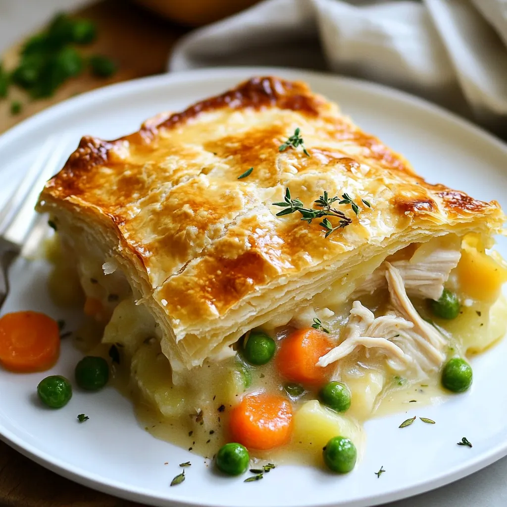 A hearty and comforting chicken pot pie filled with tender chicken, vegetables, and a creamy sauce, all encased in a flaky crust.