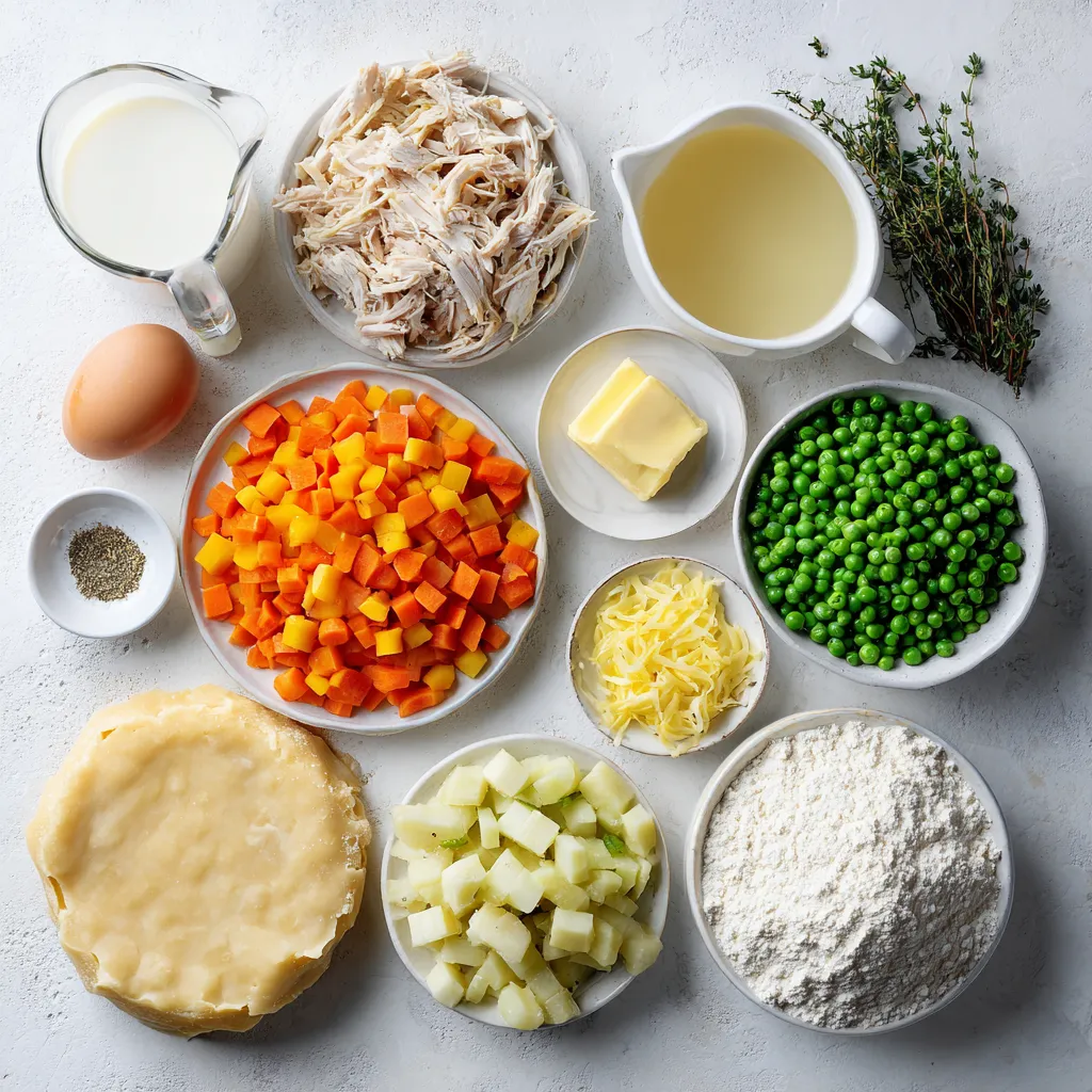 I love using fresh and simple ingredients in my chicken pot pie. The star is the chicken. Shredded chicken gives the pie a tender bite. Carrots add sweetness, while peas bring a pop of color. Diced potatoes make it hearty. Celery and onion add great flavor.