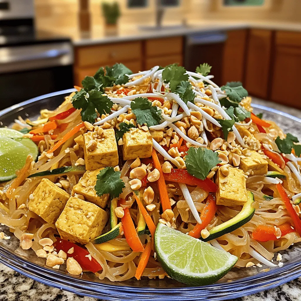![Cooking Vegetable Pad Thai is fun and easy. Gather these fresh ingredients for a tasty meal: - 8 oz rice noodles - 2 tablespoons vegetable oil - 1 cup tofu, cubed - 1 red bell pepper, thinly sliced - 1 carrot, julienned - 1 zucchini, julienned - 2 green onions, chopped - 2 cloves garlic, minced - 2 eggs, lightly beaten (optional) - 1/4 cup soy sauce - 2 tablespoons tamarind paste - 2 tablespoons brown sugar - 1 tablespoon chili sauce (adjust to taste) - 1/2 cup bean sprouts - 1/4 cup crushed peanuts - Fresh cilantro leaves for garnish - Lime wedges for serving These ingredients create rich flavors and bright colors. The rice noodles give you a chewy base. Tofu adds protein, while the vegetables bring crunch and nutrition. The sauce blends sweet, salty, and tangy notes. You can adjust the chili sauce to match your spice level. If you want to skip eggs, that's fine too. Just follow the [Full Recipe] for all the steps needed. Enjoy the process and the delicious results! To cook rice noodles properly, start by bringing a pot of water to a boil. Once boiling, add the noodles. Cook them for about 5 to 8 minutes until they are al dente. Drain the noodles well and rinse them under cold water. This step helps stop the cooking and keeps them firm. Key points to avoid mushy noodles include not overcooking and rinsing them with cold water right after cooking. For cooking tofu to perfection, begin by pressing it to remove excess moisture. Cut it into small cubes. Heat vegetable oil in a large skillet or wok over medium-high heat. Add the tofu and cook for about 5 to 7 minutes until golden brown. Remove the tofu and set it aside. When stir-frying vegetables, aim for a high heat. Add garlic first, then toss in the red bell pepper, carrot, and zucchini. Stir-fry for about 3 to 4 minutes until they start to soften but stay crisp. To incorporate sauce and seasonings, add the cooked rice noodles back into the skillet. Pour in the soy sauce, tamarind paste, brown sugar, and chili sauce. Toss everything together until the noodles are well coated and heated through. Make sure to mix in the tofu, chopped green onions, and bean sprouts evenly. This ensures a balanced flavor distribution. For a final touch, serve it hot, garnished with crushed peanuts, fresh cilantro, and lime wedges on the side. For the complete dish, check the Full Recipe. For a great Vegetable Pad Thai, choose quality ingredients. I recommend using Kikkoman or San-J for soy sauce. For tamarind paste, look for brands like Thai Kitchen or Aroy-D. To balance sweetness and spice, use brown sugar and chili sauce wisely. Start with a small amount of chili sauce, then adjust to your taste. This balance makes your dish flavorful without overwhelming it. Stir-frying is key to a perfect Pad Thai. Use high heat and a well-seasoned wok for the best results. If you use a skillet, keep the heat high too, but watch your cooking time. In a wok, you can toss the food more easily. This helps all the flavors blend well and keeps the veggies crisp. To garnish, add crushed peanuts and fresh cilantro on top. This gives a nice crunch and bright color. Lime wedges on the side add a fresh pop. Serve your Pad Thai in a large bowl or plate to show off the vibrant colors. Pair it with a light salad for a complete meal. Enjoy every bite of this dish! {{image_2}} If you want a vegan dish, skip the eggs. You can use silken tofu instead. It adds creaminess and protein. You can also try chickpeas or lentils for a hearty bite. For more color and flavor, add vegetables like broccoli or snap peas. They bring crunch and nutrition. You can add shrimp or chicken for extra protein. If you choose shrimp, cook them for about three minutes. For chicken, slice it thinly and cook for five to seven minutes. Make sure the chicken is no longer pink. This keeps the meal safe and tasty. To make your Pad Thai gluten-free, look for rice noodles labeled gluten-free. You can also use tamari instead of soy sauce. Always check labels to avoid hidden gluten. When cooking, keep your utensils clean to prevent cross-contamination. Enjoy the fresh flavors without worry. For the complete recipe, check out the Full Recipe. To keep your leftover Pad Thai fresh, use airtight containers. Glass or plastic containers work well. Make sure they seal tightly to prevent air from getting in. Store your Pad Thai in the fridge for up to three days. When reheating, the best method is to use a skillet. Heat it over medium heat. Add a splash of water or oil to keep it moist. Stir often to warm it evenly. Reheat for about 5-7 minutes until hot. Yes, you can freeze Vegetable Pad Thai. To freeze, let it cool completely first. Then, place it in freezer bags or containers. Squeeze out as much air as possible. For thawing, leave it in the fridge overnight before reheating. This keeps the flavors intact. Pad Thai is a famous dish from Thailand. It has a rich history and ties to Thai culture. Street vendors often serve it, making it popular with locals and tourists. The dish combines rice noodles, protein, and vegetables. It usually has a sweet, salty, and tangy flavor. You can find it in many Thai restaurants worldwide. Yes, you can make Vegetable Pad Thai ahead of time. This makes meal prep easy! Cook the noodles and stir-fry the veggies. Store them separately in airtight containers. Keep them in the fridge for up to three days. When you are ready to eat, just heat and combine them. This method helps keep your noodles from getting soggy. Vegetable Pad Thai is packed with nutrients. It has a mix of fresh vegetables like bell peppers, carrots, and zucchini. These veggies add vitamins and fiber. Tofu adds protein, making it a balanced meal. The dish can also be lower in calories if you use less oil. Overall, it’s a healthy choice for lunch or dinner. For the complete recipe, check out the Full Recipe. You’ll find all the steps to make this tasty dish at home. Enjoy cooking! This blog post covered all the key steps to crea