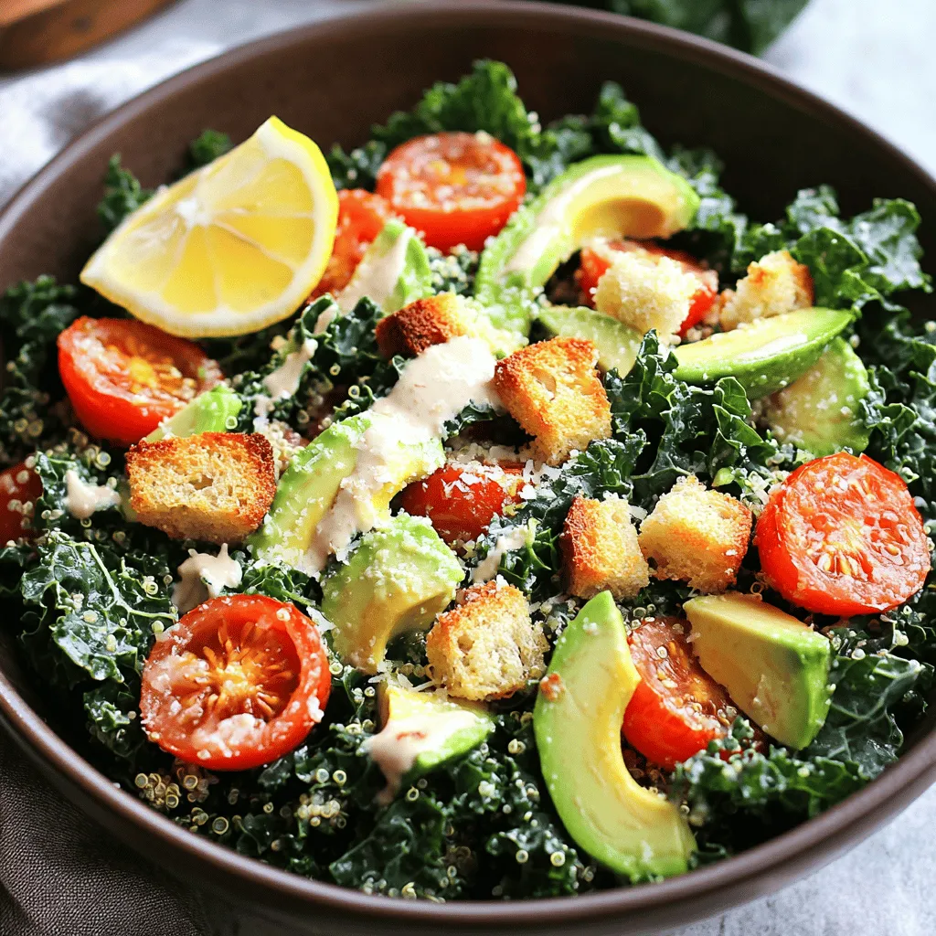 ![- Romaine lettuce - Vegetarian-friendly Caesar dressing - Croutons (store-bought or homemade) For a tasty vegetarian Caesar salad, start with fresh romaine lettuce. It gives a crisp texture and vibrant color. Next, choose a vegetarian-friendly Caesar dressing. This dressing is key for that classic flavor. You can find many options at stores or make your own. Lastly, add croutons. You can buy them or make them at home. Croutons add a nice crunch. - Vegetarian Parmesan cheese - Protein alternatives (chickpeas, beans) - Seasonal vegetables (like bell peppers or cucumbers) If you want to enhance your salad, consider some optional add-ins. Vegetarian Parmesan cheese gives a savory flavor. You can also add protein alternatives like chickpeas or beans. They help make the salad more filling. Seasonal vegetables, like bell peppers or cucumbers, can add color and freshness. Mix and match these to suit your taste. For the full recipe, check out the details above. 1. In a pot, boil 2 cups of vegetable broth. 2. Add 1 cup of rinsed quinoa to the boiling broth. 3. Reduce heat to low, cover the pot, and simmer for about 15 minutes. 4. Check when the liquid is absorbed. Fluff the quinoa with a fork. 5. Set it aside to cool while you prepare the other ingredients. 1. Preheat your oven to 350°F (175°C). 2. Spread 4 cups of torn kale leaves on a baking sheet. 3. Drizzle with 1 tablespoon of olive oil and season with salt and pepper. 4. Massage the leaves gently with your hands to coat evenly. 5. Bake for 10-15 minutes until crispy and slightly browned. 1. In a small bowl, whisk together 2 tablespoons of lemon juice, 1 tablespoon of Dijon mustard, 1 minced garlic clove, and 2 tablespoons of tahini. 2. Gradually add water, one tablespoon at a time, until you reach your desired consistency. 1. In a large mixing bowl, combine the cooked quinoa, crispy kale, and 1 cup of halved cherry tomatoes. 2. Add ½ cup of grated Parmesan cheese or nutritional yeast for a vegan option. 3. Drizzle the dressing over the salad and toss to combine well. 4. Top with sliced avocado and croutons before serving. Find the full recipe above for a delicious twist on a classic salad. To make crispy kale, start by removing the stems and tearing the leaves. Wash them well and dry thoroughly. Next, drizzle with olive oil. Sprinkle salt and pepper. Massage the leaves gently to coat them evenly. Bake at 350°F (175°C) for 10-15 minutes until they are crisp and golden. Keep an eye on them to avoid burning. For fluffing quinoa, use a fork after cooking. Once the quinoa is done, let it sit for five minutes. Then, gently fluff it with a fork to separate the grains. This will give it a light and airy feel. It’s key for a great salad texture. To make the dressing pop, mix the lemon juice, Dijon mustard, garlic, and tahini well. Taste as you go. Adjust with salt, pepper, or a bit more lemon juice if needed. This adds a bright flavor that lifts the whole salad. For extra nutrition, try adding toppings like sliced avocado, cherry tomatoes, or chickpeas. You can also sprinkle vegetarian Parmesan cheese or nutritional yeast on top for a cheesy touch. These simple additions make your salad more filling and colorful. {{image_2}} You can easily make this salad vegan. First, swap out the cheese. Use nutritional yeast instead of Parmesan. It gives a great cheesy taste without dairy. Next, choose a plant-based dressing. Many brands offer tasty vegan dressings. This change keeps your salad creamy and rich. Want to try something new? Add global flavors to your salad. For a Mediterranean twist, mix in some olives and feta cheese. This adds a briny taste that pairs well with the greens. Or, go for a Southwest style! Toss in corn and black beans for a hearty touch. These additions bring a fun and fresh vibe to the classic Caesar. Explore these variations and use the [Full Recipe] as your base. You can create a unique salad every time! Store your Vegetarian Caesar Salad in an airtight container. This keeps it fresh longer. If you have leftovers, separate the dressing from the salad. This helps avoid soggy ingredients. You can store the salad in the fridge for up to three days. To keep the kale crispy, lay a paper towel inside the container. This absorbs extra moisture. For the best taste, use the salad within two days. Reheating quinoa and kale can be tricky. You want to keep the texture nice. For quinoa, place it in a microwave-safe bowl. Add a splash of water to keep it moist. Heat in short bursts, stirring in between. For kale, try a quick sauté in a pan. Just a minute or two will revive its crunch. If you stored the whole salad, freshen it up with a drizzle of lemon juice. This adds a bright flavor. You can also toss in a few fresh ingredients to give it life again. For the full recipe, check out the instructions above! Yes, this Vegetarian Caesar Salad is healthy. It uses fresh greens and whole grains. Quinoa adds protein and fiber. Kale offers vitamins A, C, and K. This salad has fewer calories than a classic Caesar, which uses creamy dressing and anchovies. By swapping in nutritional yeast for cheese, you reduce fat and keep flavor. This makes it a great choice for a light meal. You can prepare parts of this salad ahead of time. Cook the quinoa and store it in the fridge. You can also wash and tear the kale. Just wait to bake it until you're ready to serve. Make the dressing and keep it in a jar. This way, you can mix everything together quickly when it's time to eat. The salad stays fresh for about 2-3 days in the fridge. Keep the dressing separate until serving. If you add avocado, eat it within a day. The kale and quinoa hold up well, but the tomatoes may get soggy. Always check for freshness before eating any leftovers. If you don't like kale, try spinach or arugula. Both greens add a nice flavor and crunch. You can also use romaine lettuce for a traditional feel. Swiss chard is another option, giving a slightly different taste. Each green bri
