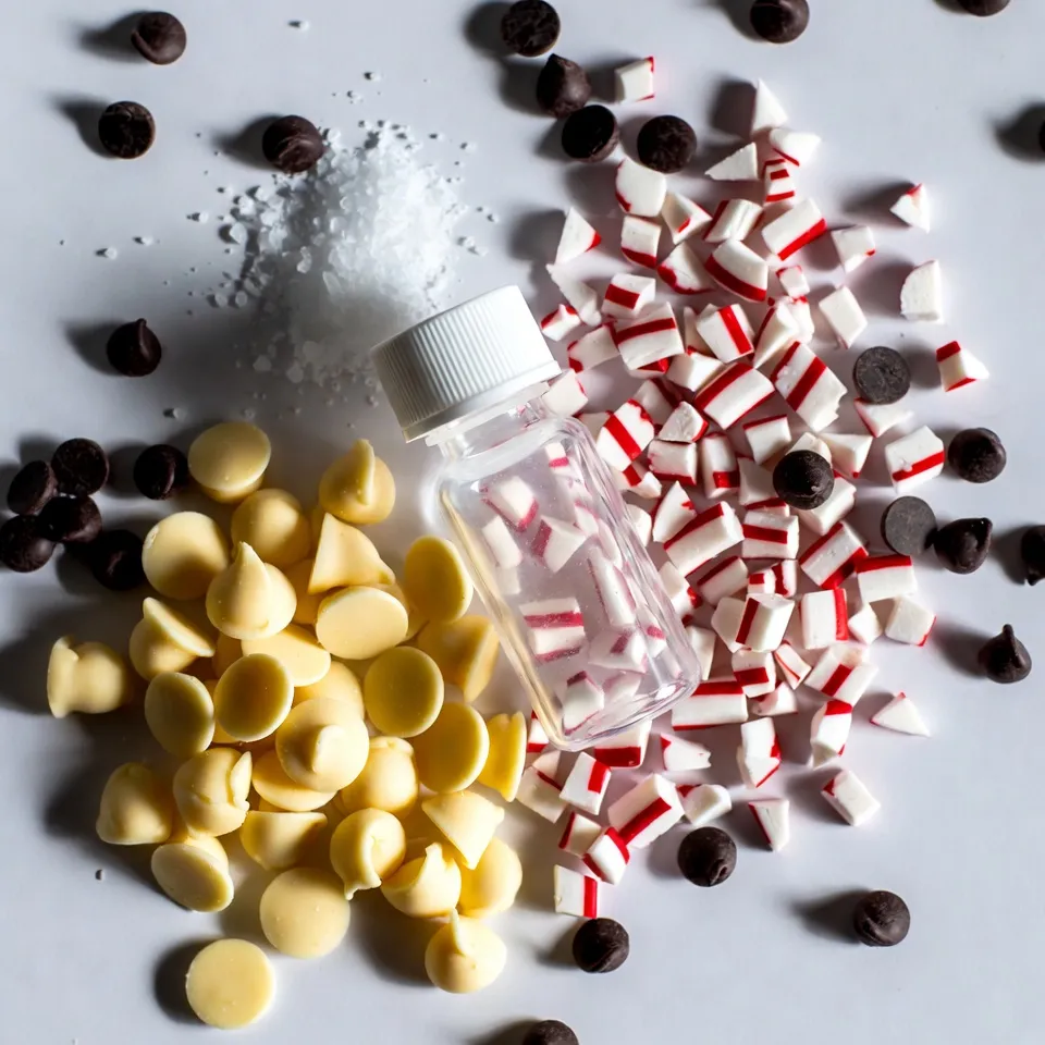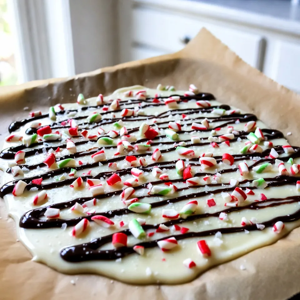 A festive treat combining white chocolate and crushed peppermint candies, perfect for the holiday season.