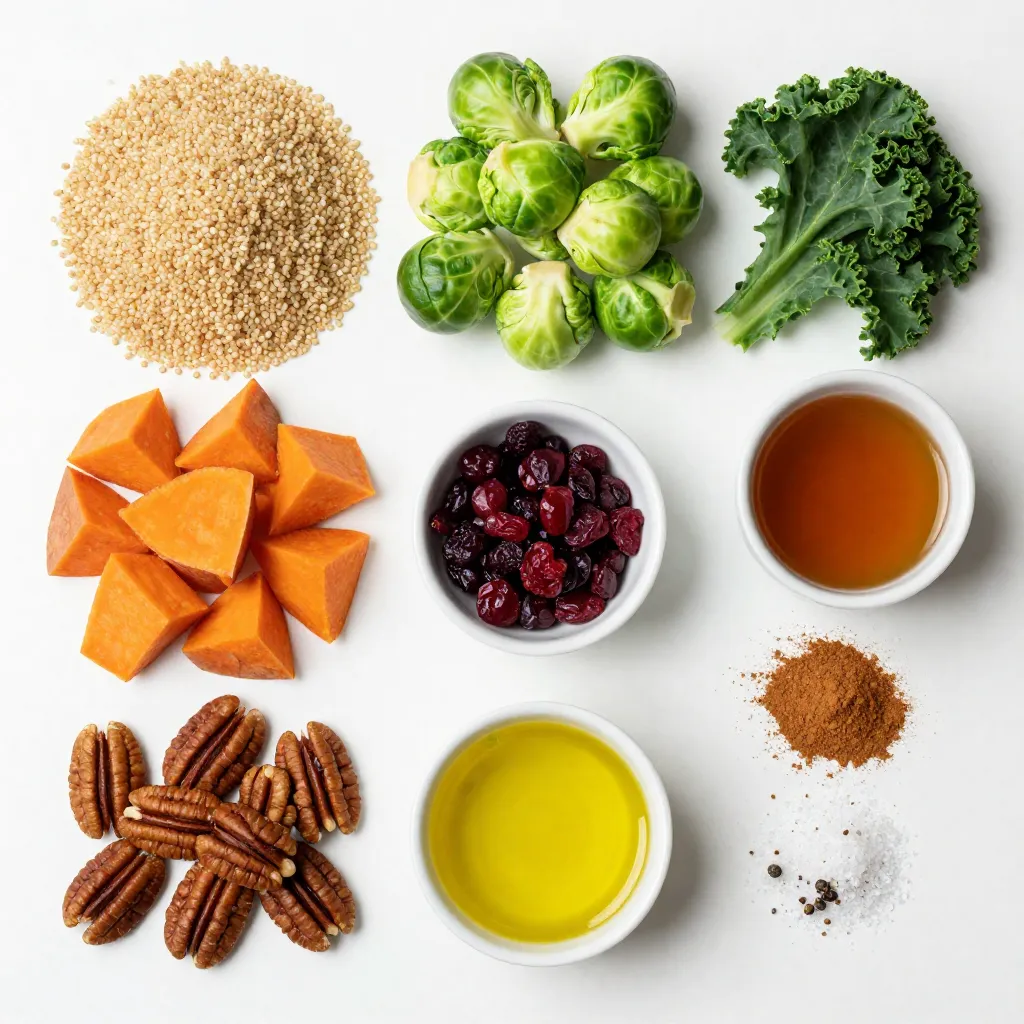 Quinoa is the star here. It is full of protein and fiber. The sweet potato adds a touch of sweetness and color. Brussels sprouts give a nice crunch. Kale packs in nutrients and a vibrant green look. The dried cranberries provide a lovely tartness, while pecans add a rich, nutty flavor.