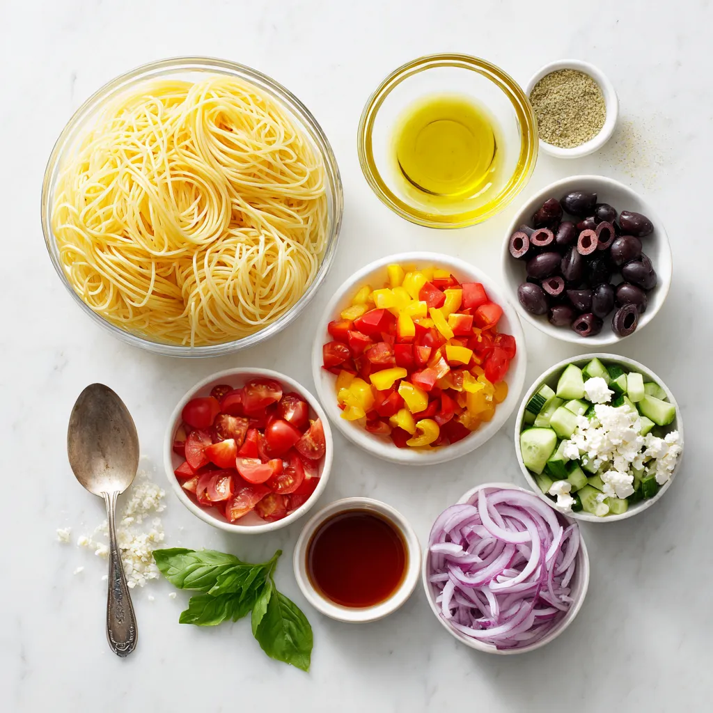 • In a large mixing bowl, combine the cooled spaghetti with cherry tomatoes, diced bell pepper, cucumber, red onion, black olives, and feta cheese.