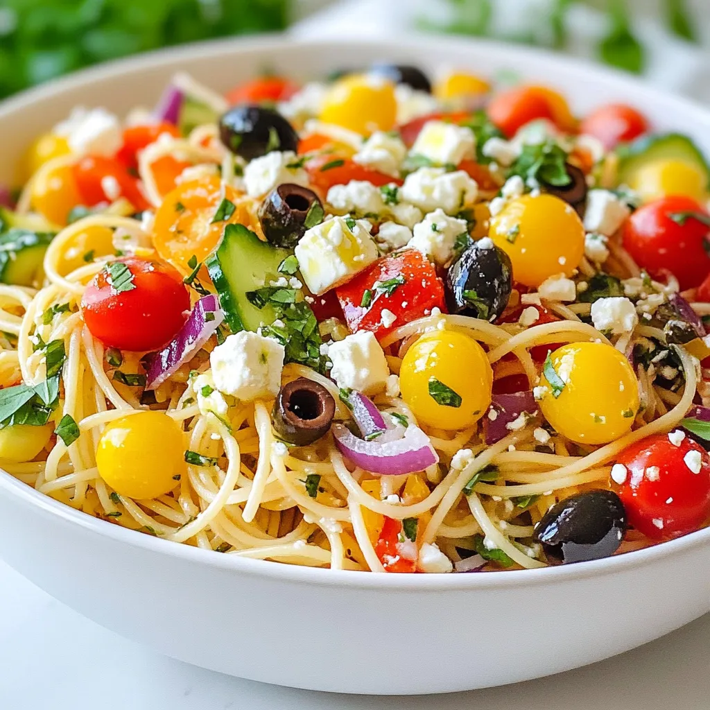 To make a Zesty Spaghetti Salad, you need fresh and colorful ingredients. Here’s what you’ll need: - 8 oz spaghetti, cooked and cooled - 1 cup cherry tomatoes, halved - 1 bell pepper (red or yellow), diced - 1 cucumber, diced - 1/2 red onion, finely chopped - 1/4 cup black olives, sliced - 1/4 cup feta cheese, crumbled - 1/4 cup fresh basil, chopped These ingredients bring great taste and texture to the salad. The spaghetti serves as a hearty base. The cherry tomatoes and cucumber add a refreshing crunch. The bell pepper and red onion give a sweet and sharp flavor. The olives and feta contribute a nice salty touch. Finally, the fresh basil brings a burst of herbaceous goodness. The dressing makes the salad come alive. You will need: - 3 tablespoons olive oil - 2 tablespoons red wine vinegar (or apple cider vinegar) - 1 teaspoon Dijon mustard - 1 teaspoon garlic powder - Salt and pepper to taste This dressing has a perfect balance of tang and richness. Olive oil adds smoothness. Vinegar gives a zesty punch. Dijon mustard adds depth, while garlic powder enhances the flavor. Salt and pepper are key for seasoning. You can change some ingredients if you like. Here are some options: - Use whole wheat spaghetti for a healthier choice. - Swap black olives for green olives. - Try goat cheese instead of feta for a different flavor. - Use any fresh herbs like parsley or cilantro in place of basil. - If you want a gluten-free option, try gluten-free pasta. These substitutions allow you to customize the salad to your taste and dietary needs. You can make it your own and enjoy every bite! {{ingredient_image_1}} Start with your spaghetti. Cook 8 oz of spaghetti in boiling water. Let it cool after cooking. In a large bowl, mix the cooled spaghetti with 1 cup of halved cherry tomatoes. Next, add 1 diced bell pepper, 1 diced cucumber, and 1/2 finely chopped red onion. Toss in 1/4 cup of sliced black olives and 1/4 cup of crumbled feta cheese. This mix brings color and crunch to your salad. Now, let’s make the dressing. In a small bowl, whisk together 3 tablespoons of olive oil and 2 tablespoons of red wine vinegar. If you prefer, use apple cider vinegar instead. Add 1 teaspoon of Dijon mustard and 1 teaspoon of garlic powder to the mix. Season with salt and pepper to taste. Whisk until everything is well combined. This dressing adds zesty flavor to the salad. Pour the dressing over your spaghetti and veggie mix. Gently toss everything together until all the ingredients are coated. Next, add 1/4 cup of chopped fresh basil. Toss again to blend the flavors. Cover the bowl with plastic wrap or transfer the salad to an airtight container. Refrigerate for at least 30 minutes. This chilling time helps the flavors meld. Before serving, give it another toss and check the seasoning. Adjust if needed for taste. Enjoy your fresh and zesty spaghetti salad! To enhance the zesty taste, start with fresh ingredients. Use ripe cherry tomatoes and crisp cucumbers. The red or yellow bell pepper adds sweetness and crunch. You can play with the dressing too. Add more Dijon mustard for a sharp kick. A dash of lemon juice gives it a nice zing. Always taste as you go. Adjust salt and pepper for the best flavor. Serve your zesty spaghetti salad in a big, bright bowl. This makes it eye-catching. For a picnic, pack it in a sealed container. It stays fresh and tasty. Pair it with grilled chicken or fish for a complete meal. You can also serve it as a side dish at barbecues or potlucks. It’s a crowd-pleaser. Garnish the salad for extra flair. Top it with fresh basil leaves. You can also sprinkle more crumbled feta cheese. A light drizzle of olive oil adds shine. For a spicy twist, add a few chili flakes. These little touches make your dish more appealing. Enjoy the vibrant colors and flavors! Pro Tips Chill Time is Key: Letting the salad sit in the refrigerator for at least 30 minutes allows the flavors to meld beautifully, enhancing the overall taste. Customize Your Veggies: Feel free to swap in your favorite vegetables or whatever you have on hand, such as zucchini or carrots, for a personal touch. Perfect Pasta Texture: Ensure your spaghetti is cooked al dente; this prevents it from becoming mushy when mixed with the dressing. Herb Variations: Experiment with different fresh herbs like parsley or mint for a unique flavor profile that complements the salad. {{image_2}} You can easily make this salad vegetarian. The base is already meat-free. Add more veggies for taste and color. Try adding avocados for creaminess. You can also use artichoke hearts. They add a nice flavor and texture. Want to boost the protein? Add cooked chicken or shrimp. These options work well with the flavors. For a quick fix, use canned chickpeas or black beans. They mix well and add great taste. If you need a gluten-free version, swap the spaghetti for rice noodles. They are light and tasty. You can also use zucchini noodles. They offer a fresh twist and are low in carbs. Make sure your dressing is gluten-free too. Use tamari instead of soy sauce if needed. After you enjoy your zesty spaghetti salad, save the leftovers. Place the salad in an airtight container. Make sure to cover it well. This helps keep the salad fresh. Store it in the fridge. It should stay good for about three days. I do not recommend freezing this salad. The veggies can lose their crunch. The pasta may become mushy too. If you have extra dressing, you can freeze that. Just store it in a small container. It will be great for future salads. Reheating is not needed for this salad. You can enjoy it cold. If you prefer it warm, heat the spaghetti only. Add a bit of olive oil to help it warm up. Mix it again with the salad. This adds a new twist to your meal. Yes, you can make Zesty Spaghetti Salad ahead of time. This salad tastes even better after the flavors mix. I recommend making it a few hours in advance. You can store it in the fridge for up to two days. Just cover it well to keep 